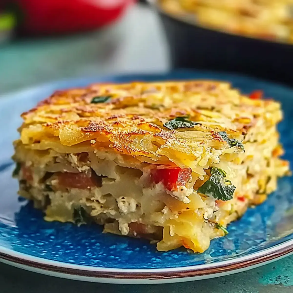 - Spread the sautéed vegetables over the baked hash browns, then pour the tofu mixture evenly over the top.