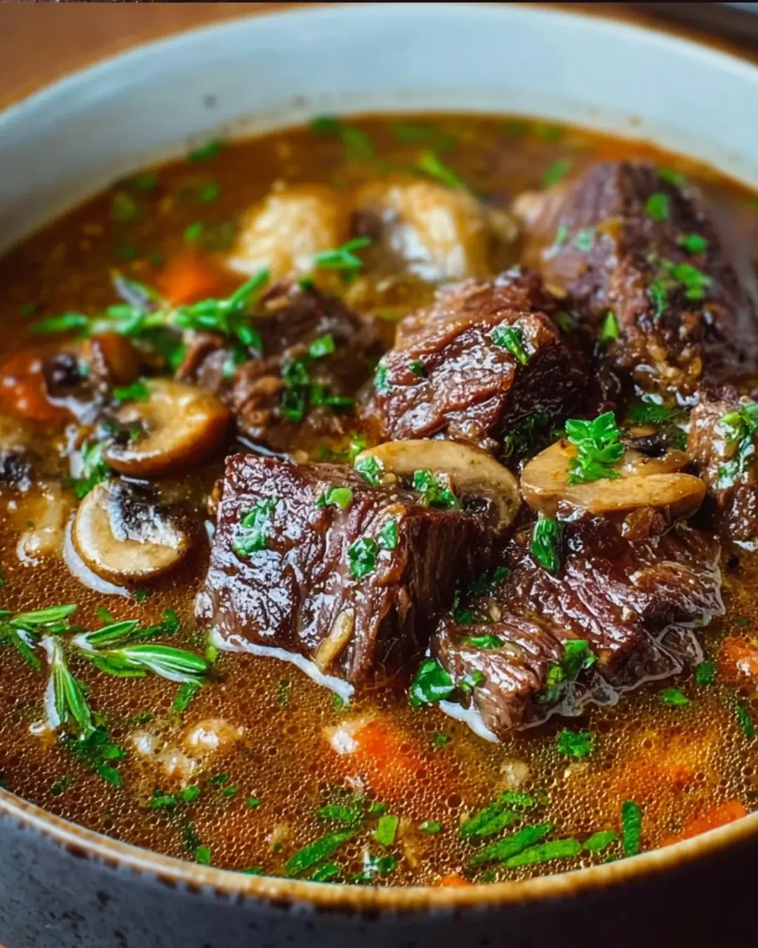 A comforting and hearty soup made with tender beef short ribs and mushrooms, perfect for chilly days.