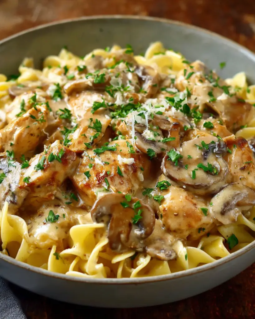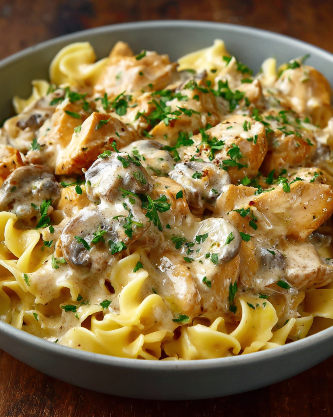 A flavorful and creamy chicken stroganoff served over egg noodles, perfect for a comforting dinner.