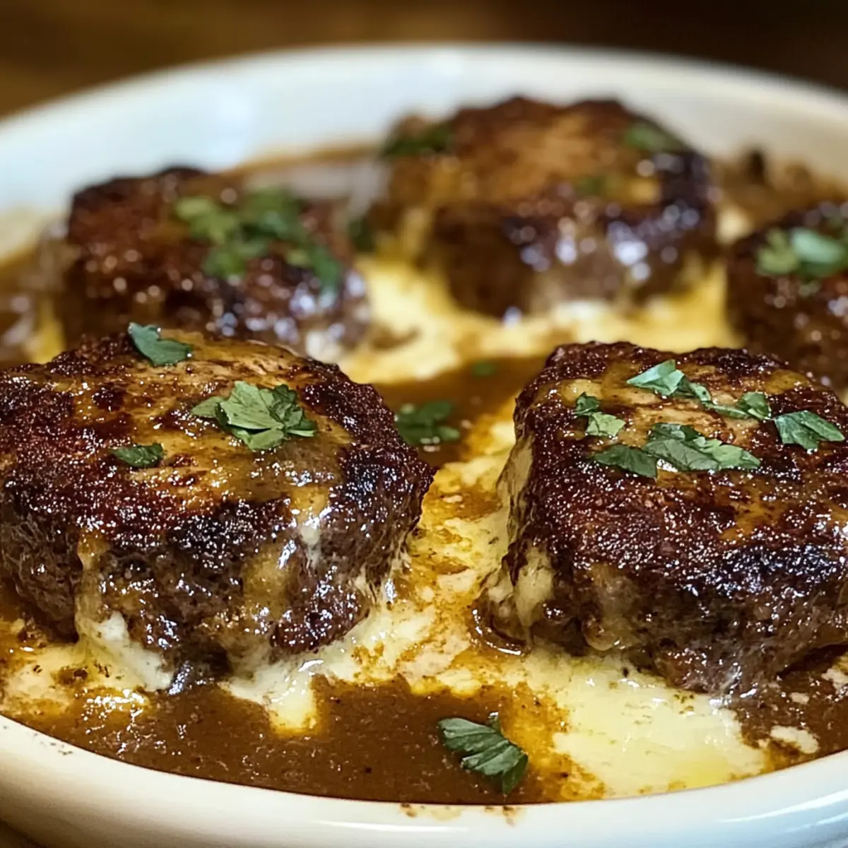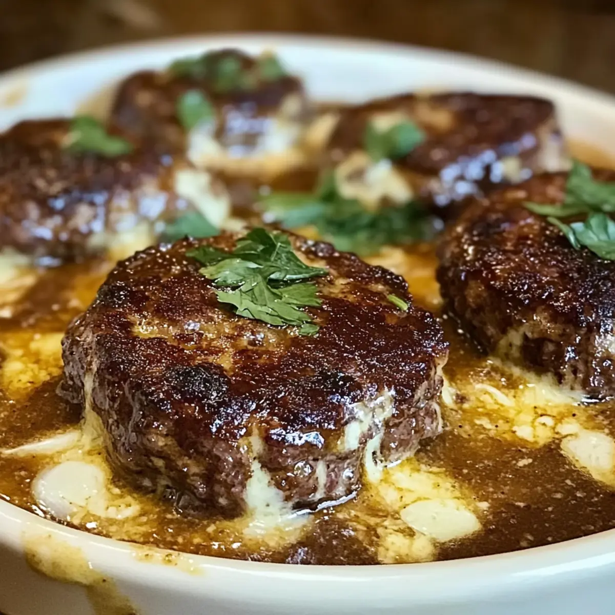 - Let the dish rest for a few minutes before serving. Spoon gravy over each patty and enjoy with mashed potatoes or vegetables.