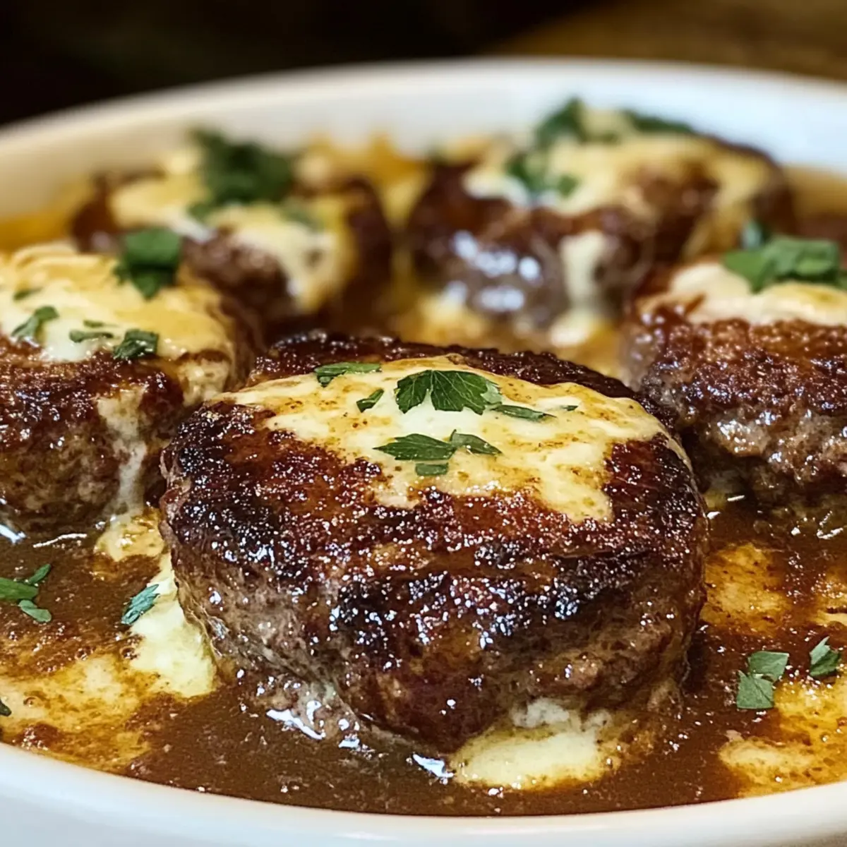 Rich, Savory Gravy: The luscious gravy enveloping the hamburger steaks elevates the entire dish, creating deep flavors that satisfy.