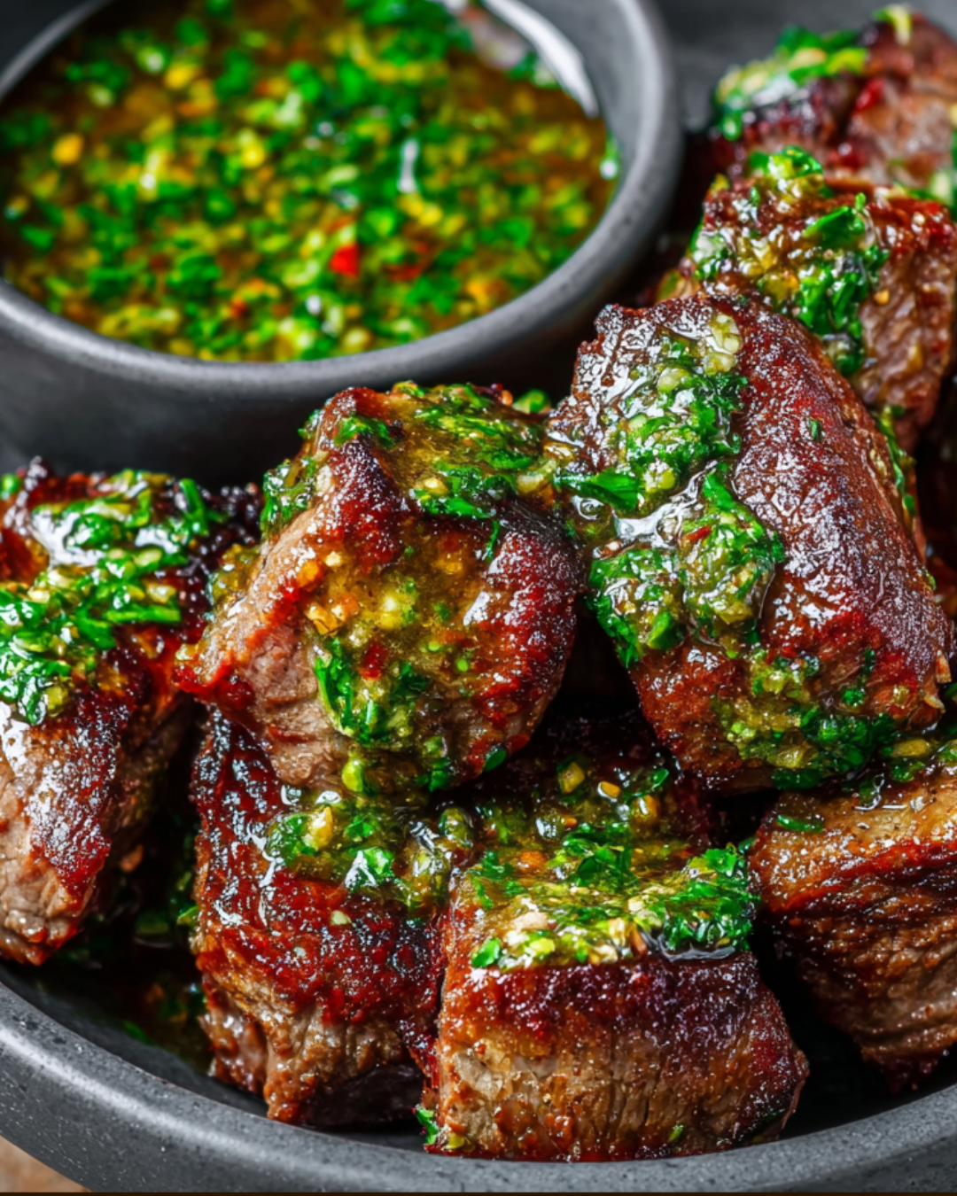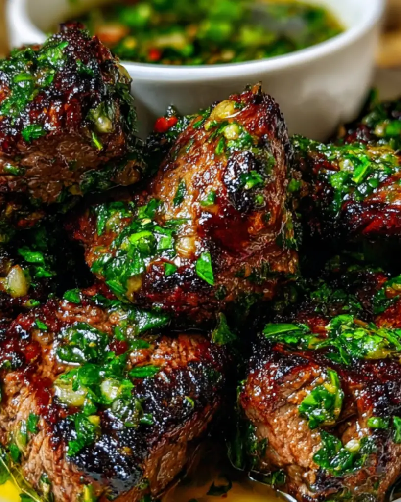 - Serve the steak bites drizzled with chimichurri sauce on top or on the side for dipping.