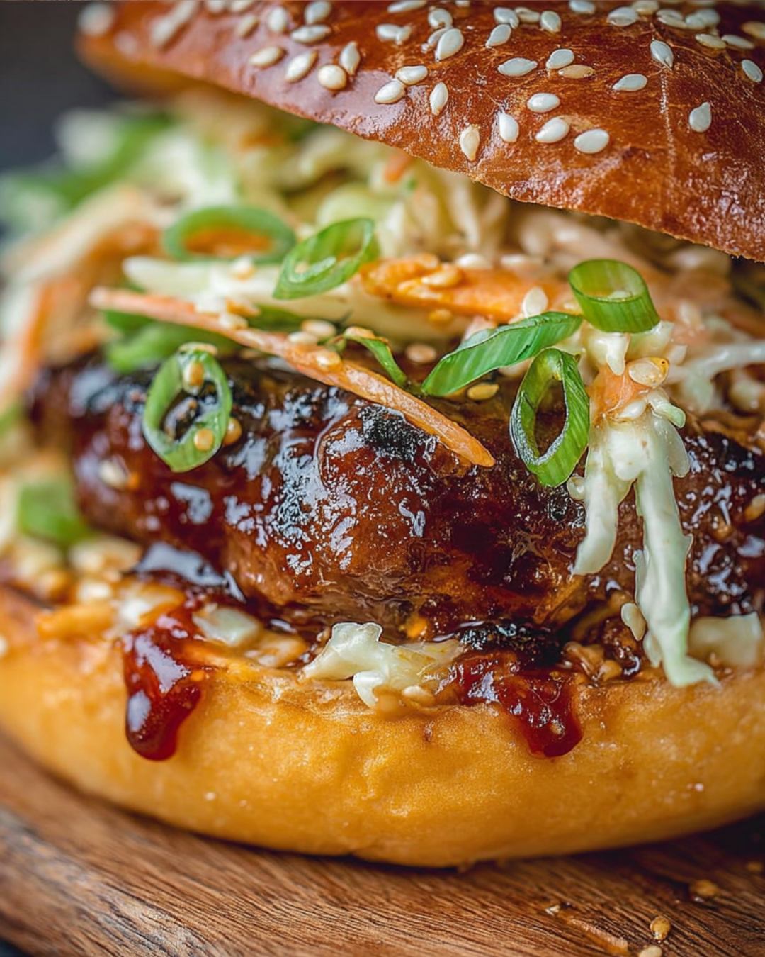 - Assemble the burgers by placing a patty on each bun, topping with a generous scoop of kimchi slaw, and garnishing with chopped green onions. Serve immediately.