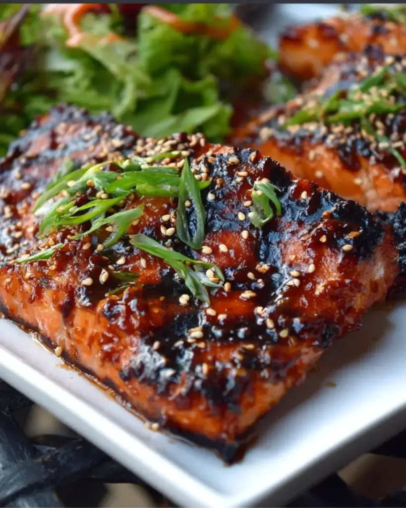 - During the last minute of grilling, sprinkle the chopped green onions and sesame seeds over the salmon.