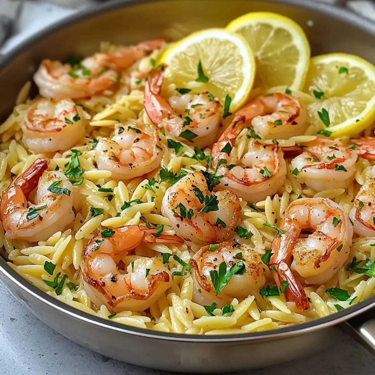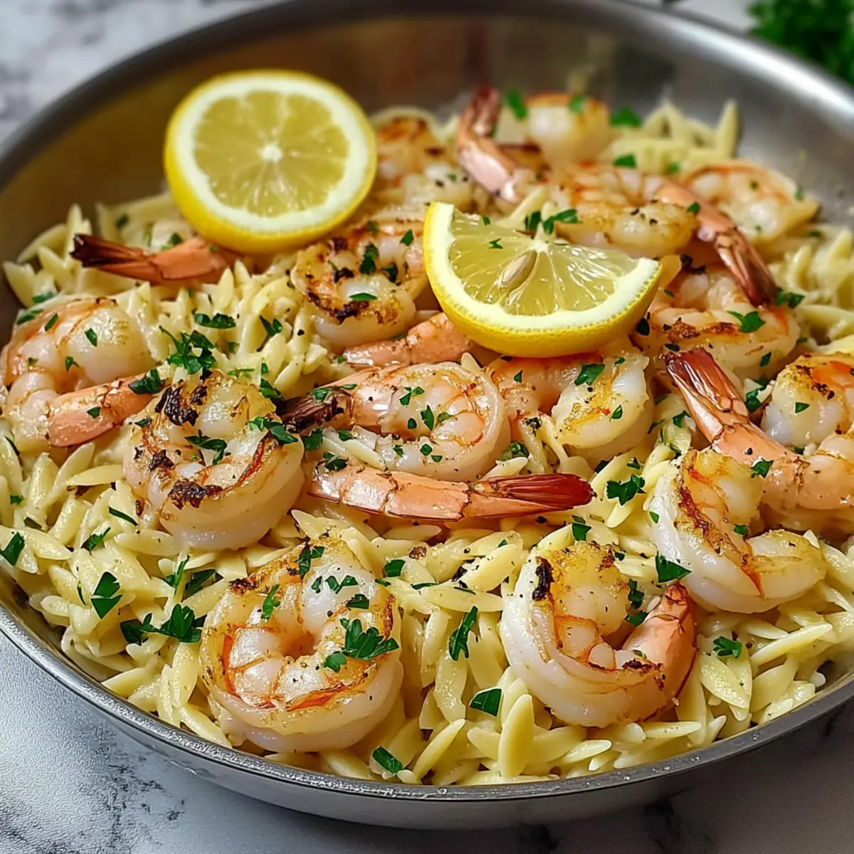 Remove the skillet from heat and sprinkle the dish with fresh parsley for a vibrant finish. If desired, garnish with lemon slices to enhance the presentation and fresh citrus flavor. Serve your delightful Lemon Garlic Shrimp Orzo immediately, savoring the comforting and zesty goodness of this one-pan meal!