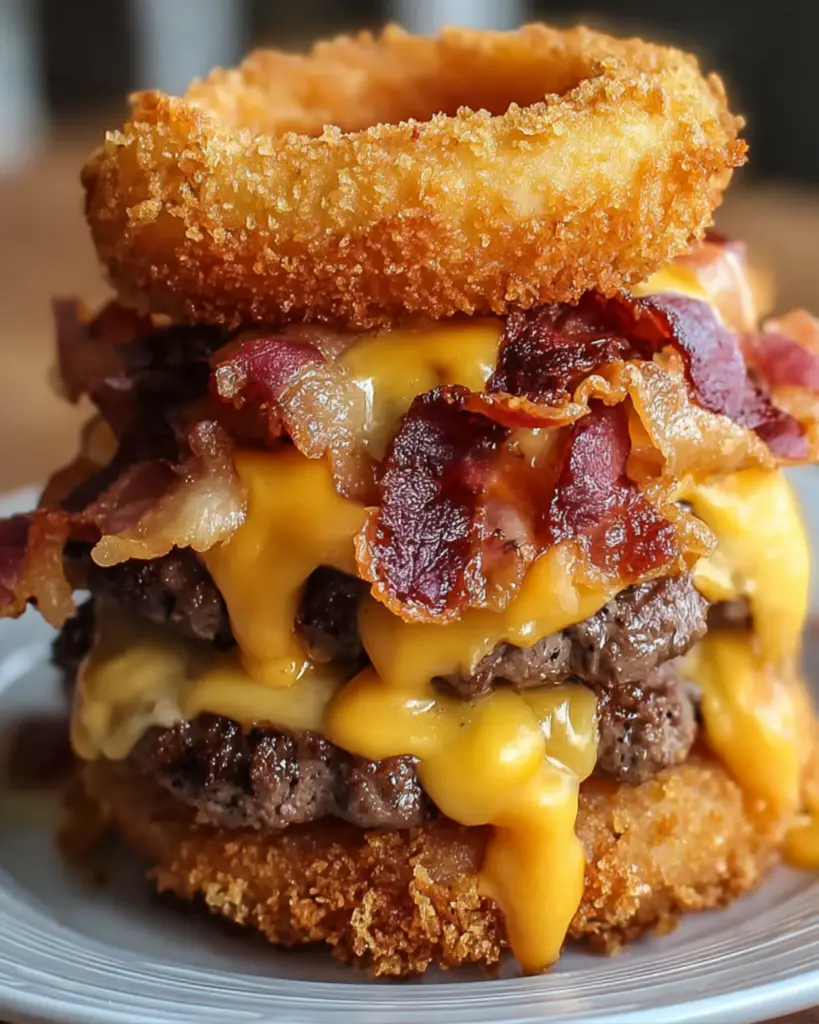 A delicious and indulgent Loaded Bacon Cheeseburger Onion Ring recipe that combines crispy onion rings, juicy beef patties, and savory toppings.