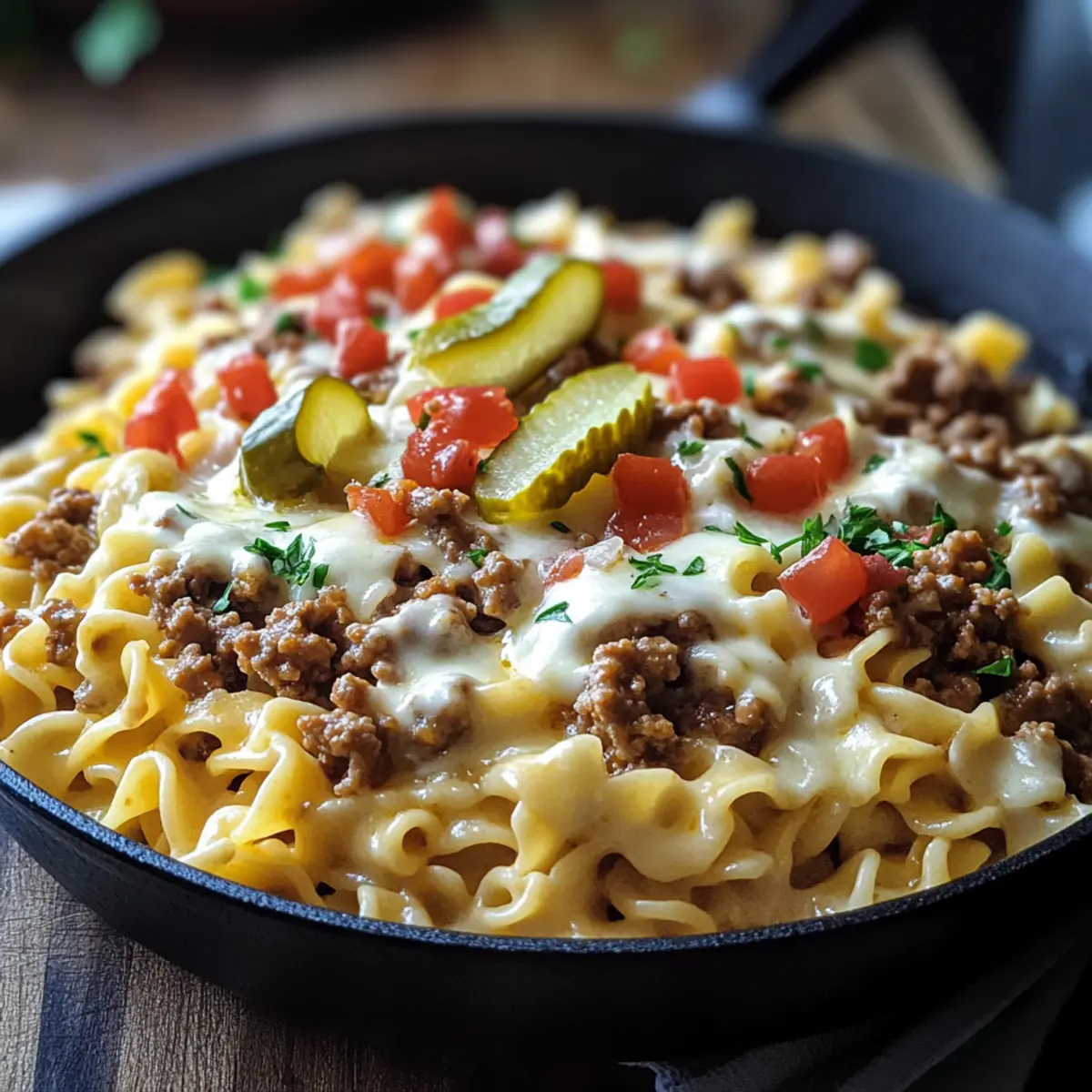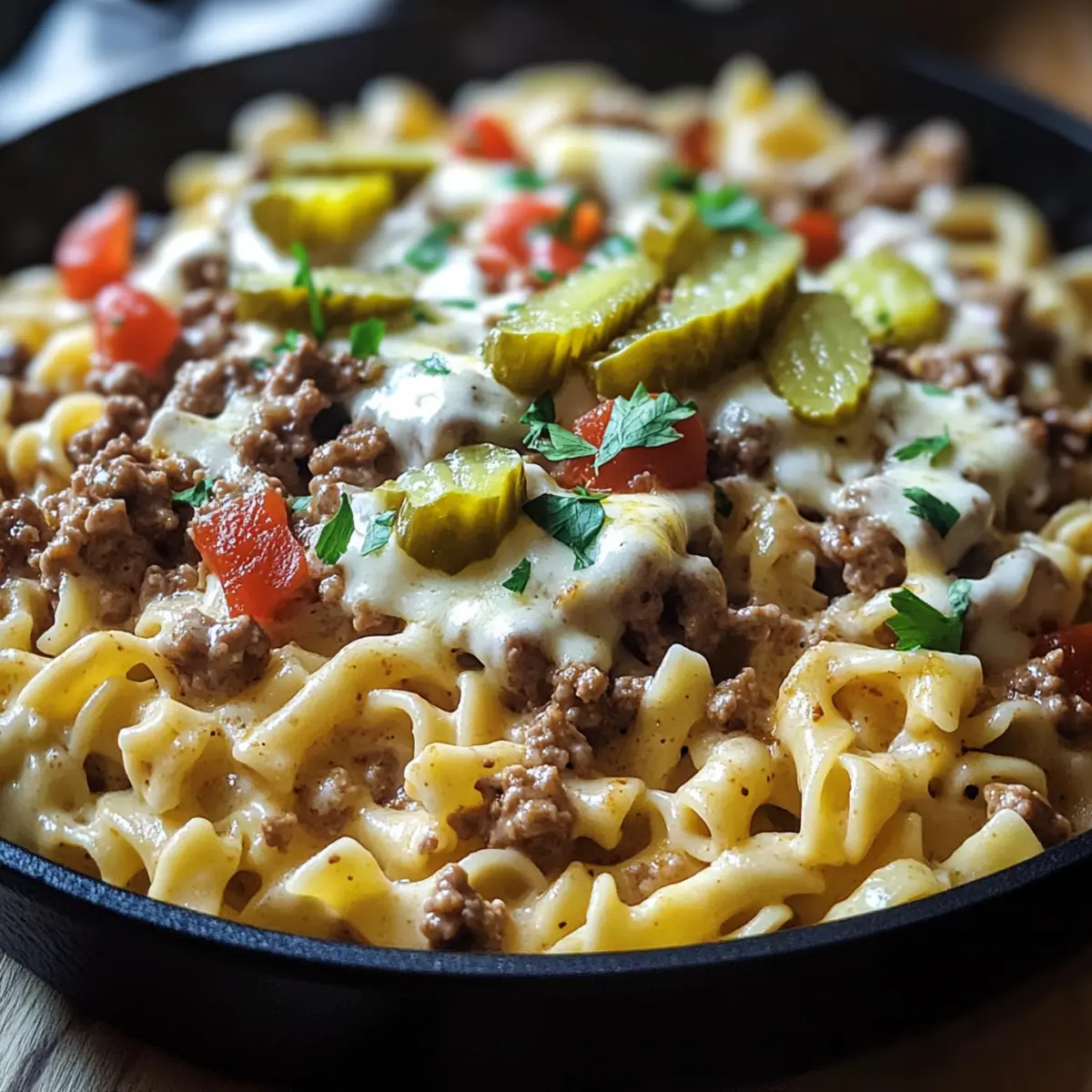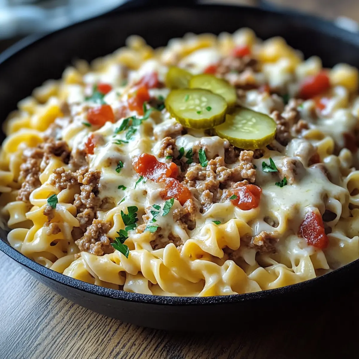 Once everything is well mixed and heated through, plate your Loaded Cheeseburger Alfredo Pasta into generous servings. Top with optional diced pickles and fresh parsley for a delightful crunch and burst of color. Serve immediately while hot, inviting your loved ones to dig into this comforting masterpiece at the dinner table.
