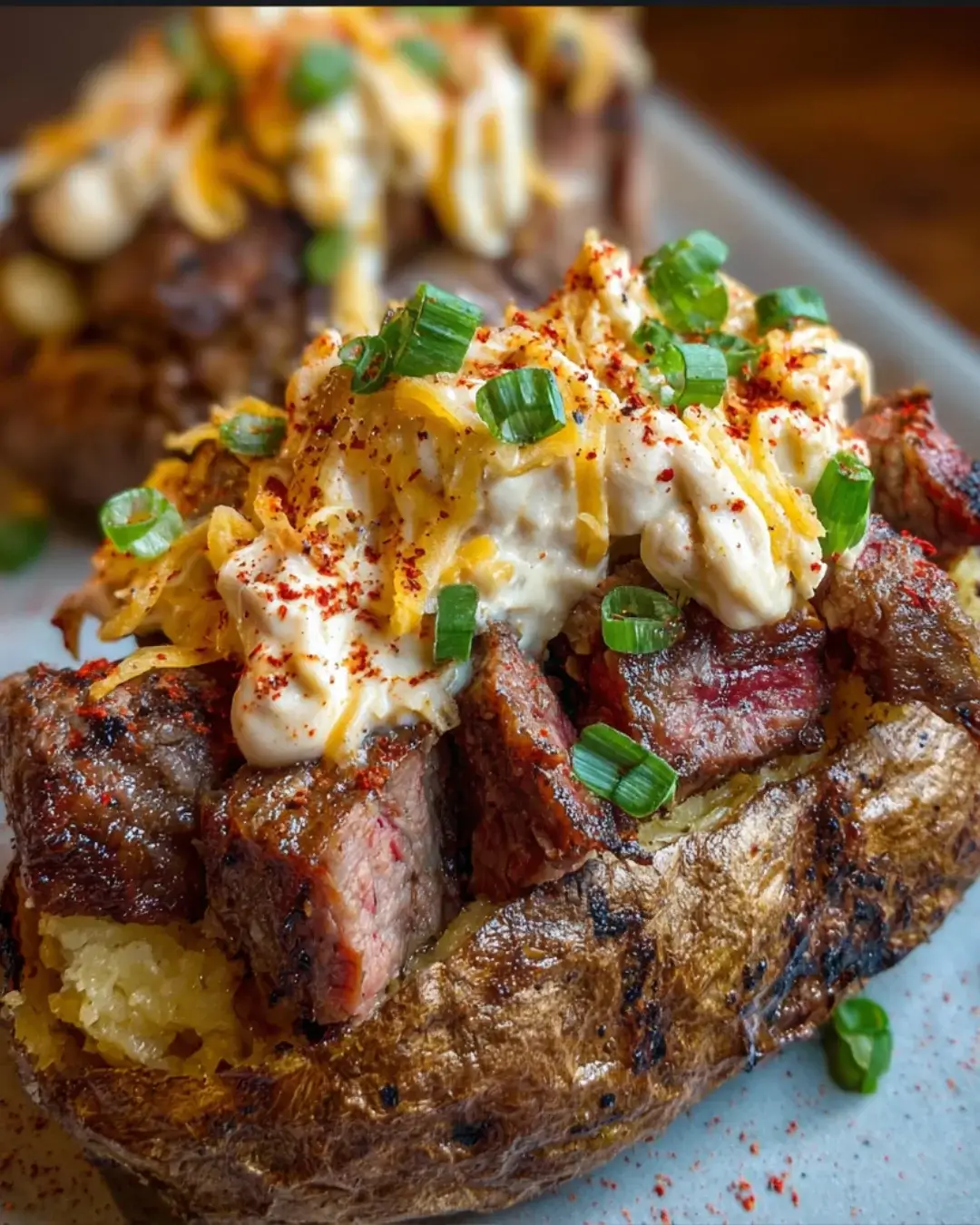 A delicious and hearty Loaded Steak Potato recipe that combines tender steak, creamy cheese, and crispy bacon for a satisfying meal.
