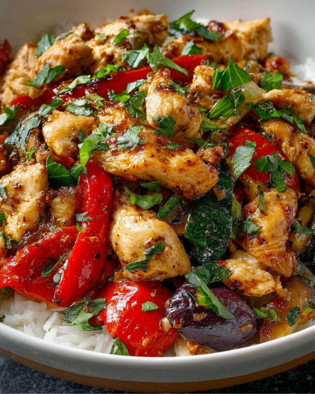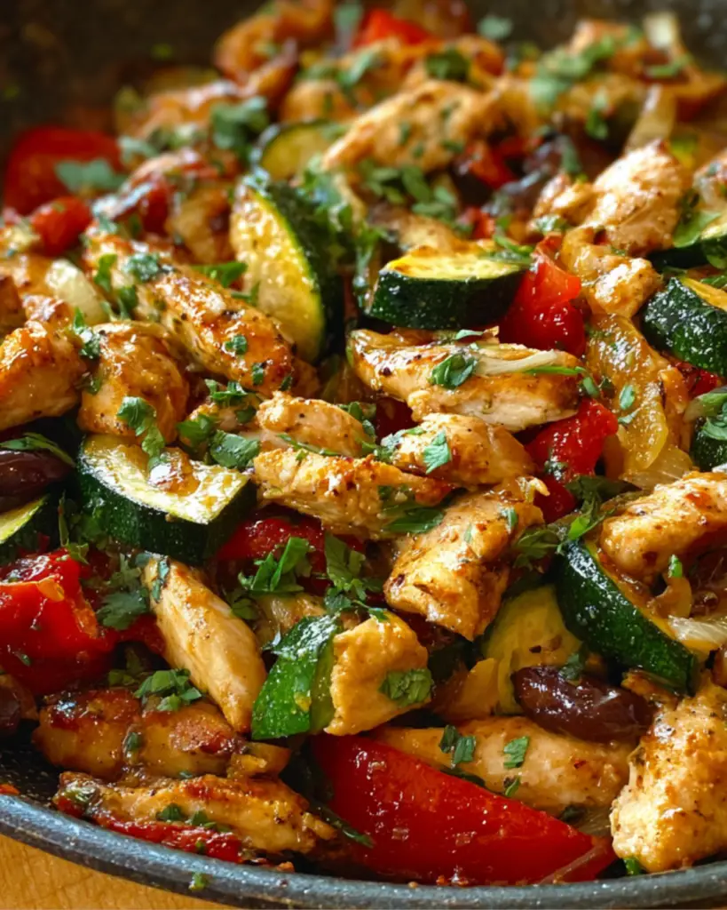 A delicious and healthy Mediterranean Chicken Stir Fry that combines tender chicken with fresh vegetables and a burst of flavor.