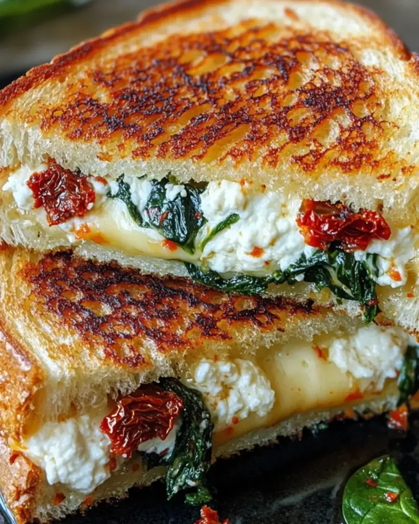 A delicious Mediterranean twist on the classic grilled cheese sandwich, featuring sun-dried tomatoes, fresh spinach, and creamy ricotta.