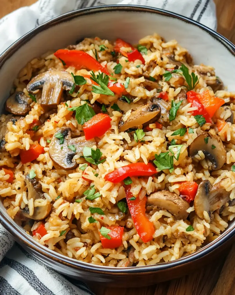 A flavorful and nutritious Mushroom and Bell Pepper Rice Pilaf that combines the earthy taste of mushrooms with the sweetness of bell peppers, perfect as a side dish or a main course.
