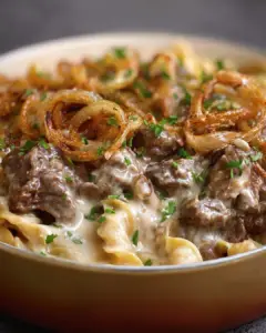 Perfect for busy weeknights or a cozy family dinner, this recipe combines the savory goodness of ground beef and crispy bacon with a creamy mushroom topping.