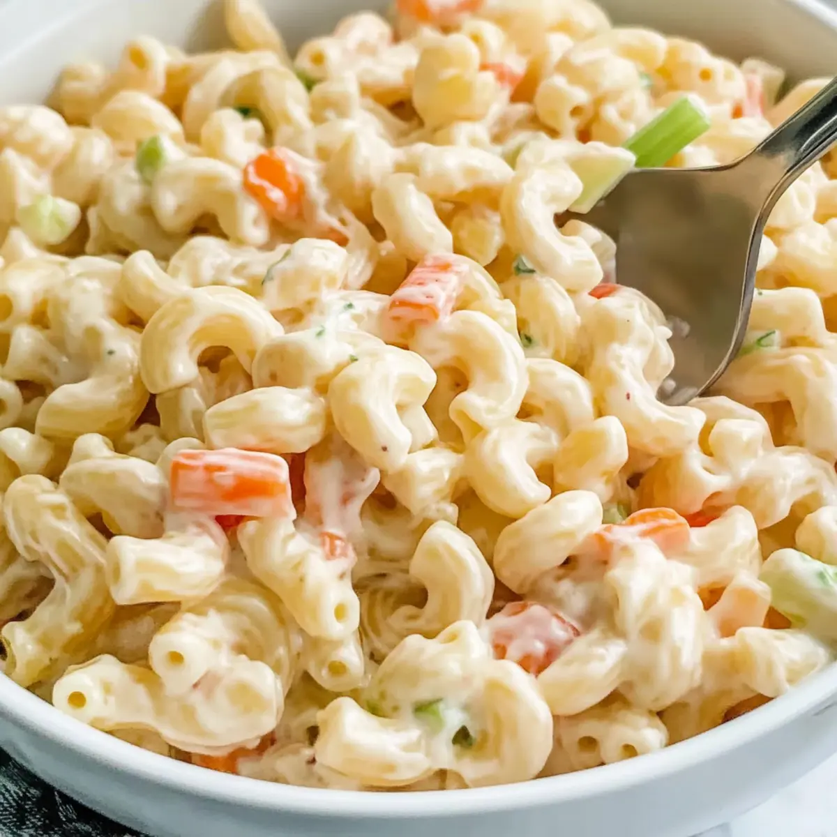 - In a large bowl, combine cooled macaroni with grated carrots, yellow onion, celery, and green onions.