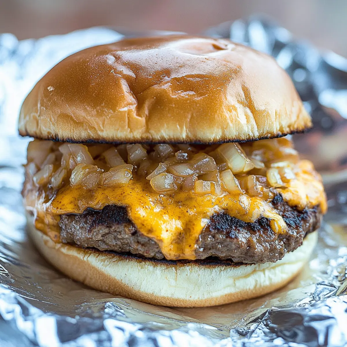 Prepare a large piece of foil for wrapping each burger. On the foil, layer the bottom bun, followed by a slice of cheese, a beef patty, some finely chopped sweet onion, a generous tablespoon of your secret sauce, and another slice of cheese. Finally, place the top bun on, and wrap each burger tightly in the foil to keep them juicy during baking.