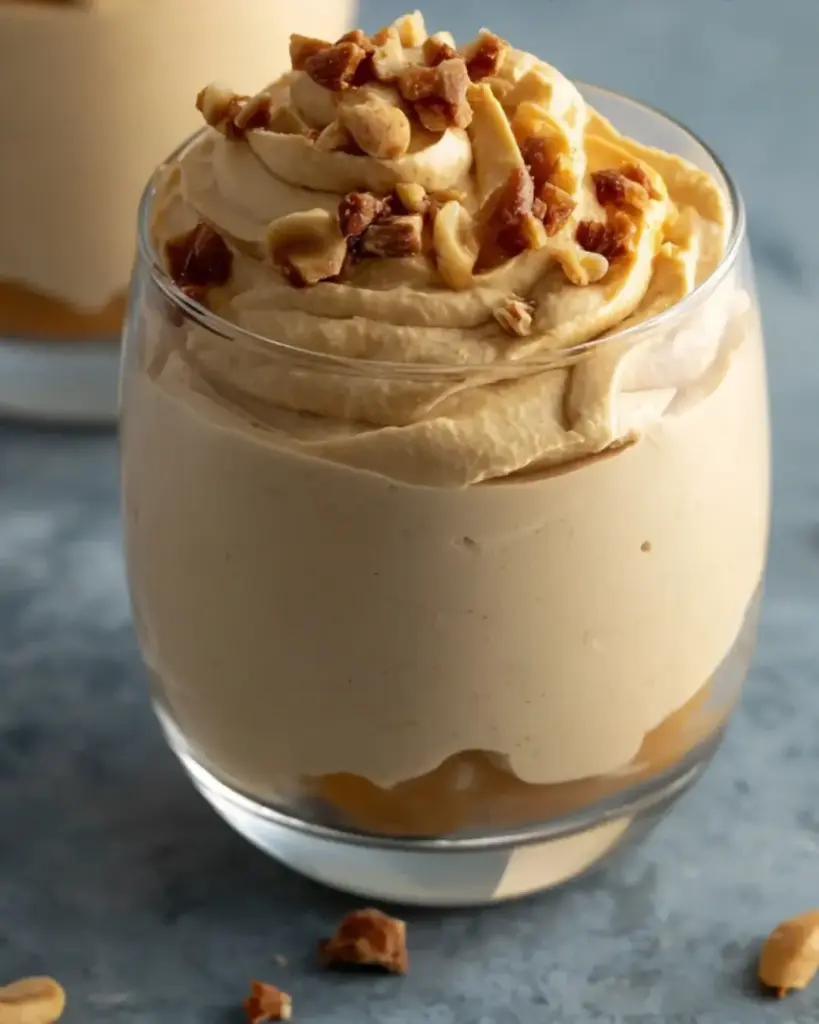 A delicious and easy-to-make Peanut Butter Mousse topped with crunchy peanuts, perfect for dessert lovers.