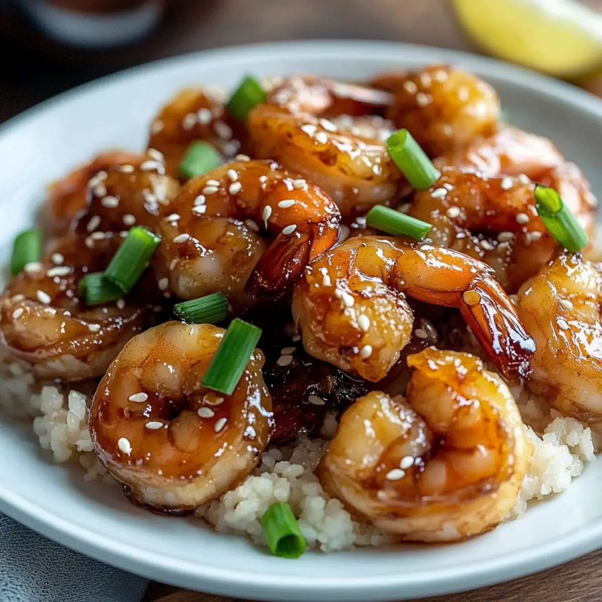 - Transfer the glazed shrimp to a serving plate and sprinkle with chopped green scallions and toasted sesame seeds.