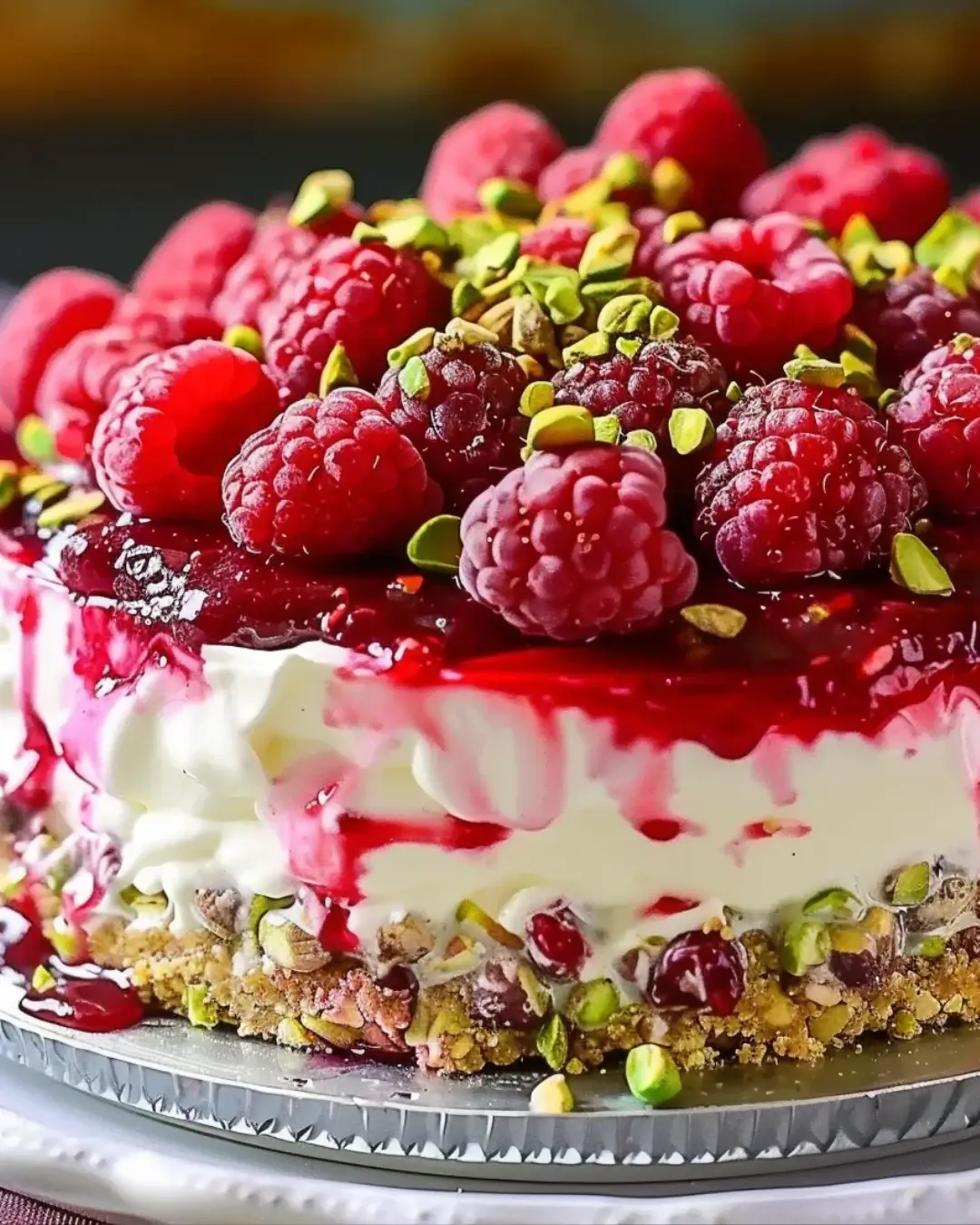 - Assemble the Cheesecake: Pour the cooled raspberry sauce evenly over the cream cheese layer. Garnish with whole raspberries and crushed pistachios on top. Cover and refrigerate for at least 4–6 hours, or overnight, until set.