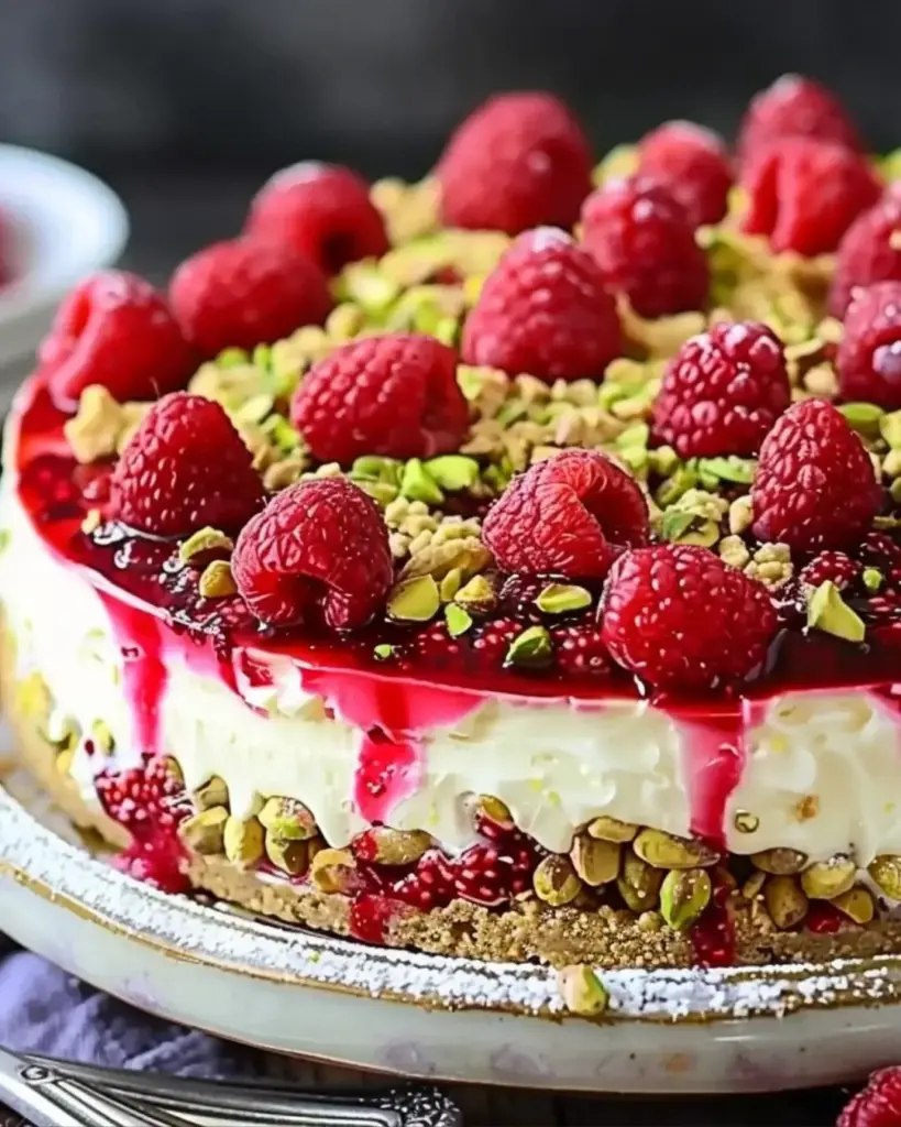 A delightful Raspberry Pistachio Cheesecake that combines a nutty crust with a creamy filling and a tangy raspberry sauce.