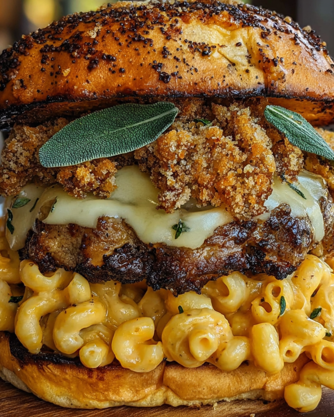 - Assemble the Burgers: Toast the hamburger buns lightly. Place a beef patty on the bottom bun. Spoon a generous portion of pumpkin mac & cheese over the patty. Sprinkle with the brown butter sage crumbs for crunch and extra flavor. Add optional toppings like caramelized onions or arugula. Cover with the top bun and serve immediately.