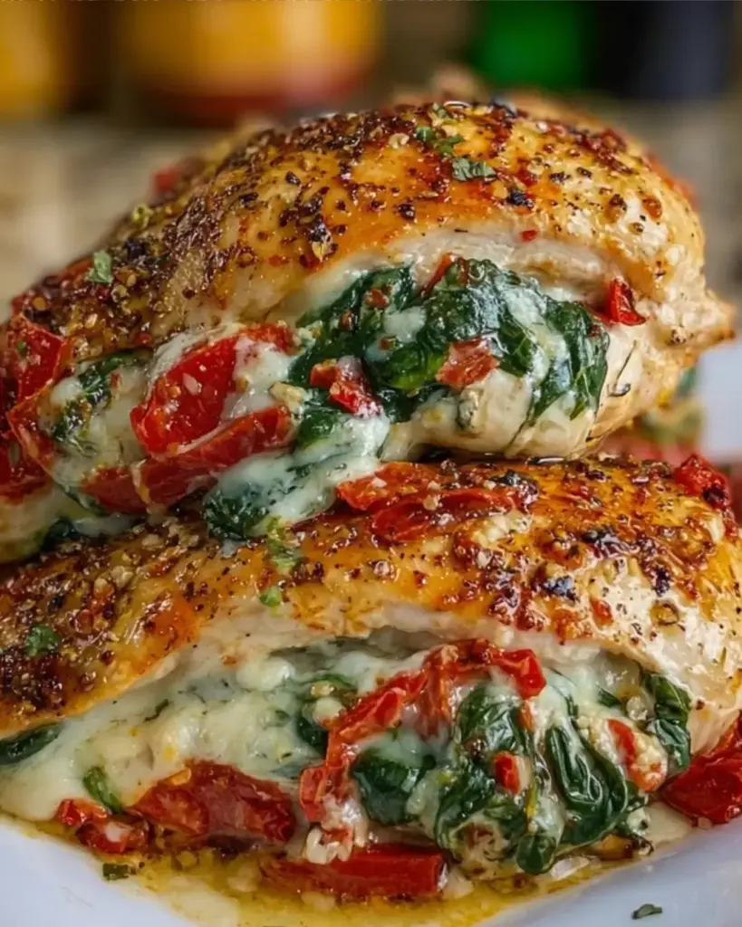A delicious and flavorful dish featuring chicken breasts stuffed with roasted red peppers, fresh spinach, and mozzarella cheese.