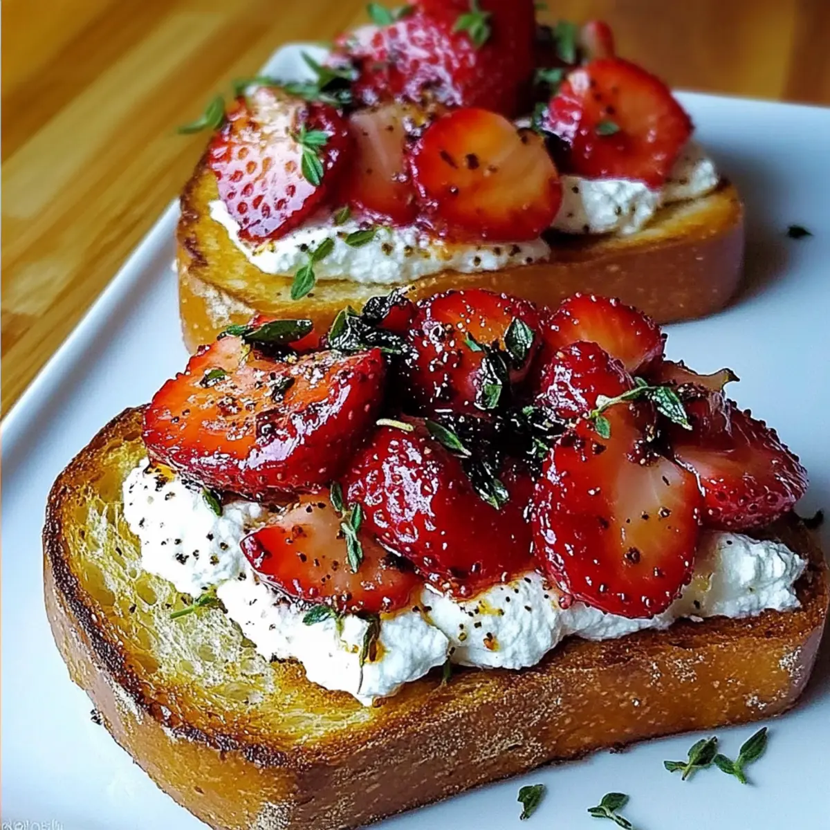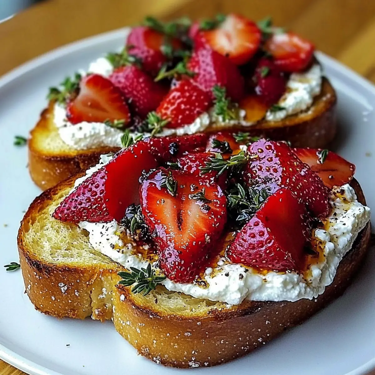To elevate your Roasted Strawberry Whipped Ricotta Toast, drizzle a touch of extra honey over the strawberries if desired. Garnish with fresh thyme leaves and a sprinkle of black pepper to bring out the flavors. Serve immediately for the best combination of warm, creamy, and crispy textures!