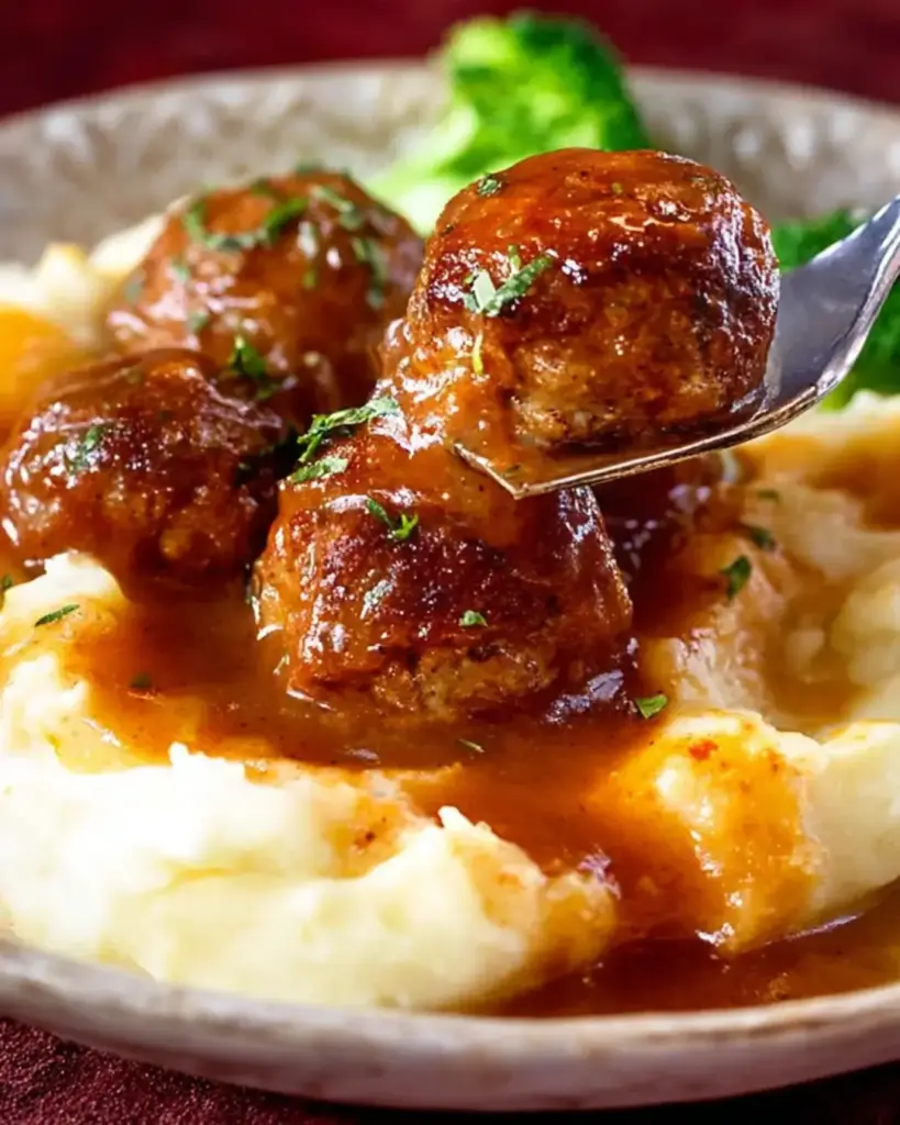 A cozy recipe for Salisbury Meatballs served with creamy mashed potatoes, perfect for a comforting meal.