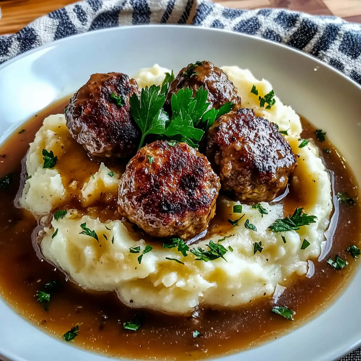 - Toss the baked meatballs in the gravy. Serve over mashed potatoes, garnished with parsley.