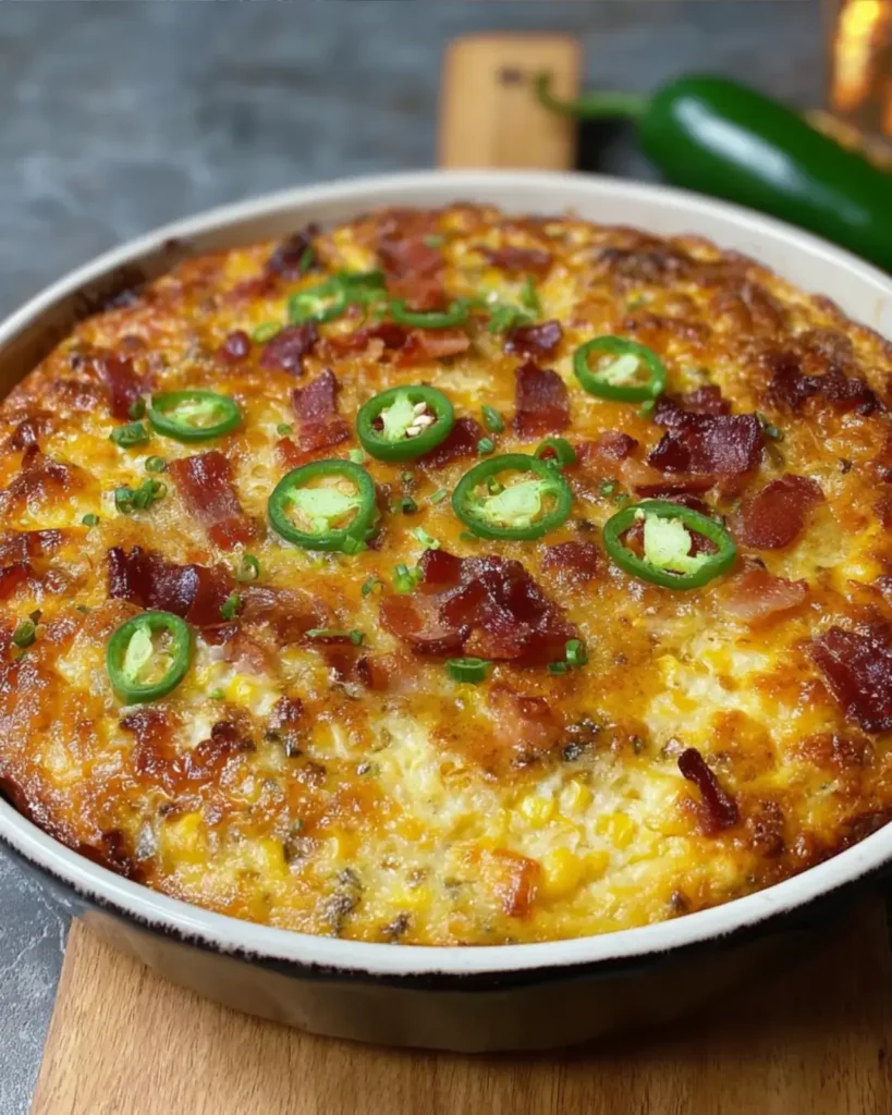 Savory Corn Pudding with Jalapeño, Pepper Jack, and Bacon is a delicious and creamy dish that combines sweet corn with spicy jalapeños and savory bacon, perfect for any gathering.