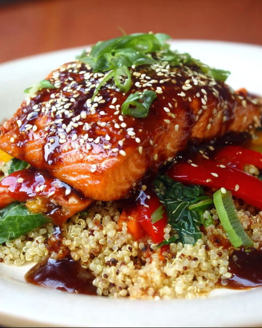 - Serve the salmon over a bed of garlic quinoa stir-fry. Drizzle with reserved teriyaki sauce and garnish with sliced green onions.