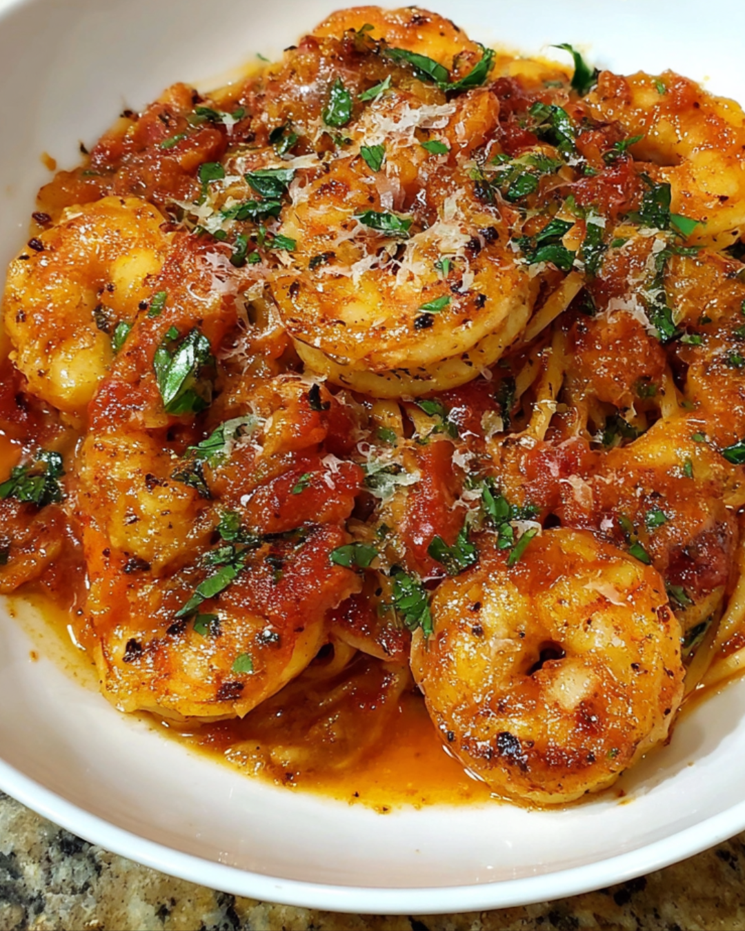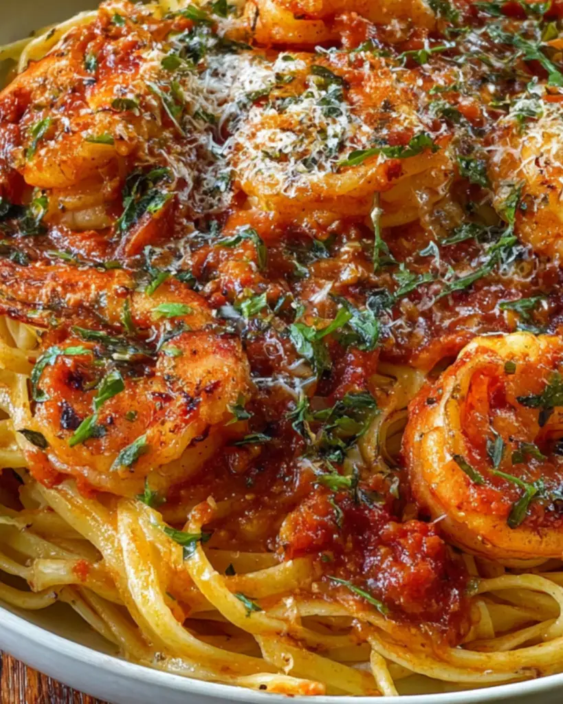 The combination of succulent shrimp and a spicy tomato sauce over pasta is simply irresistible.