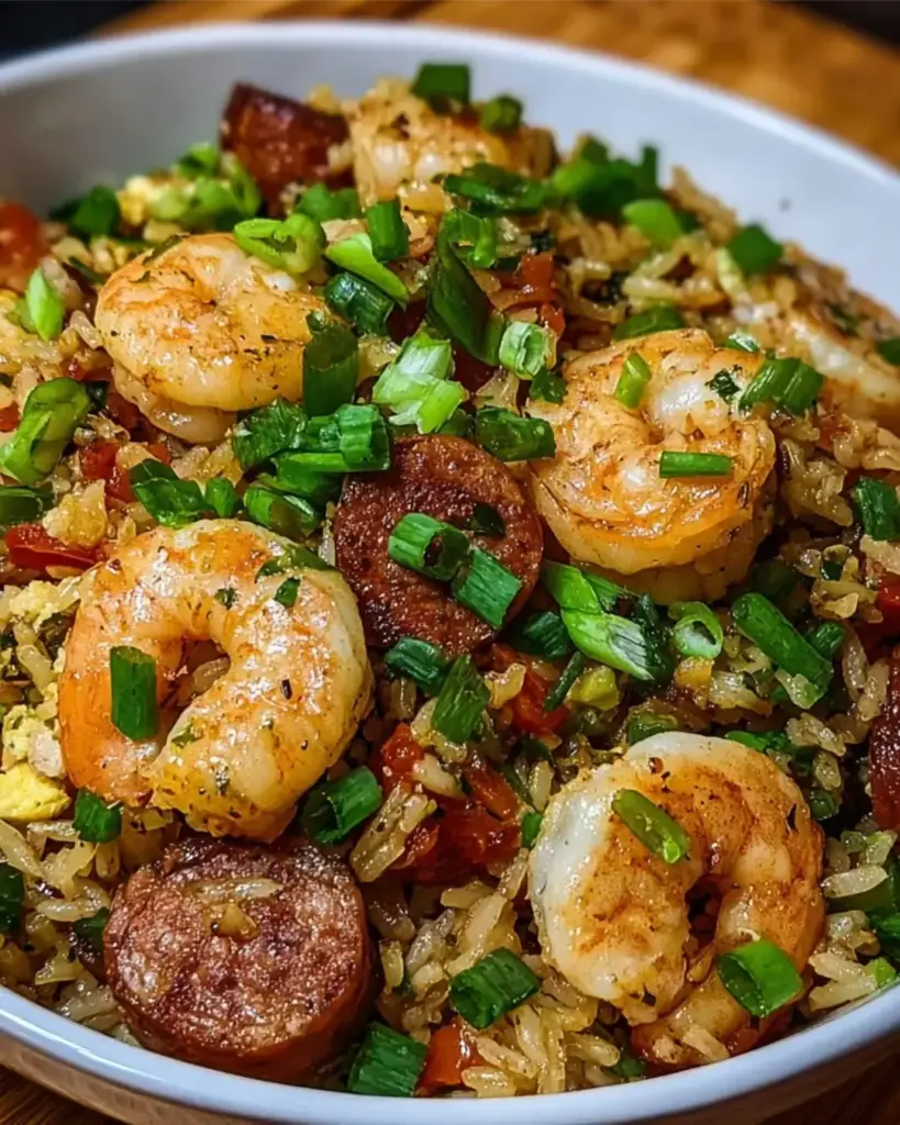 A flavorful and hearty dish combining shrimp and smoked sausage with rice, perfect for a comforting meal.
