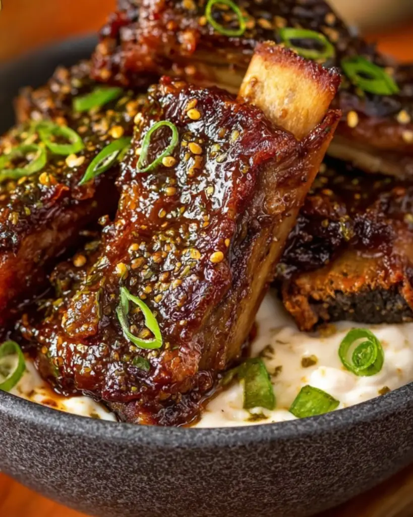 - Serve the beef ribs over a bed of udon noodles, drizzled with the thickened sauce. Garnish with sliced green onions and sesame seeds.