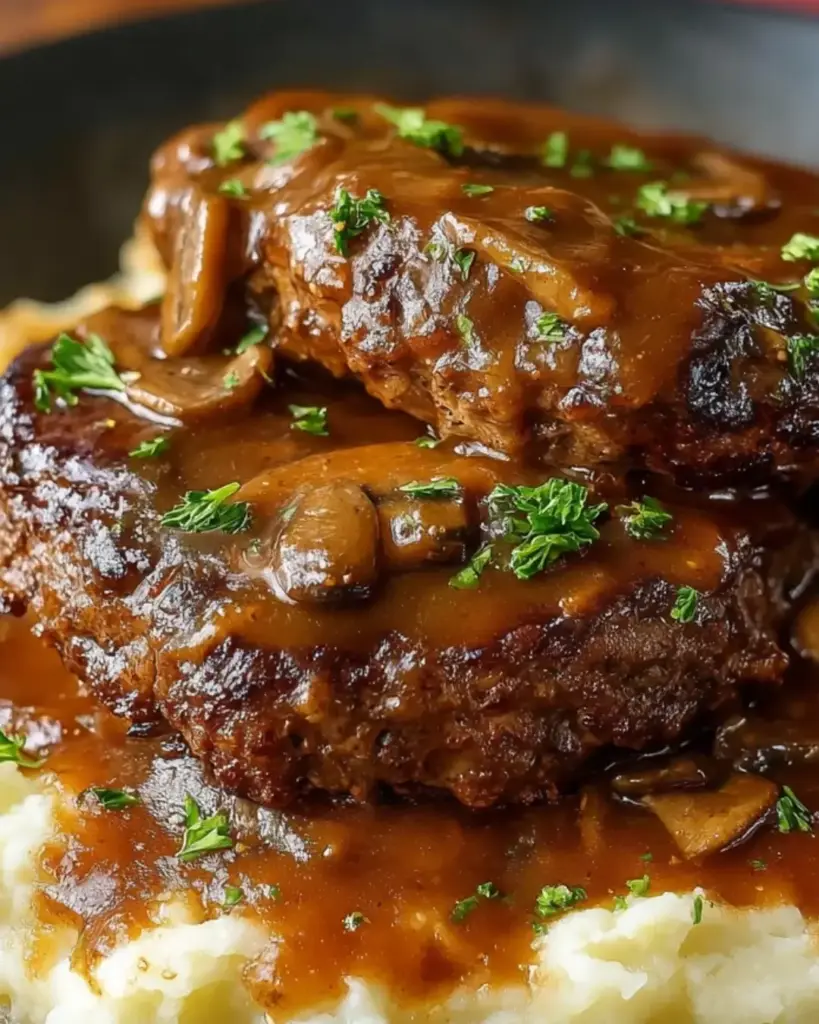 A delicious recipe for smothered hamburger steak, featuring juicy beef patties topped with a rich mushroom and onion gravy.