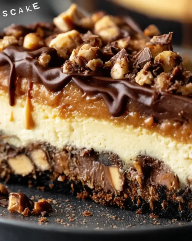 Indulge in this delicious Snickers Cheesecake, a perfect blend of creamy cheesecake and chocolatey caramel flavors.
