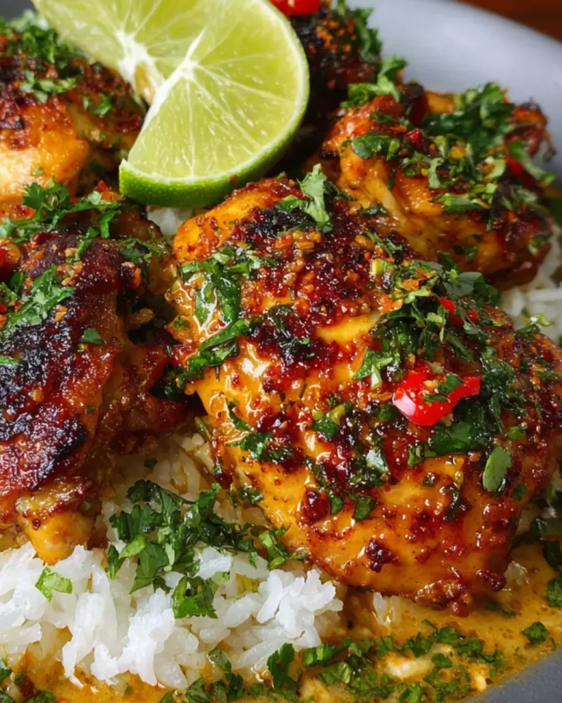 A flavorful and spicy dish featuring tender chicken thighs cooked in a creamy coconut milk sauce with aromatic spices.