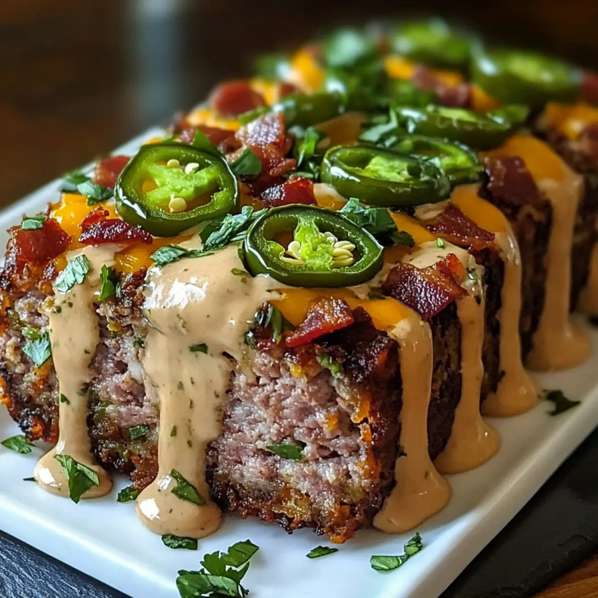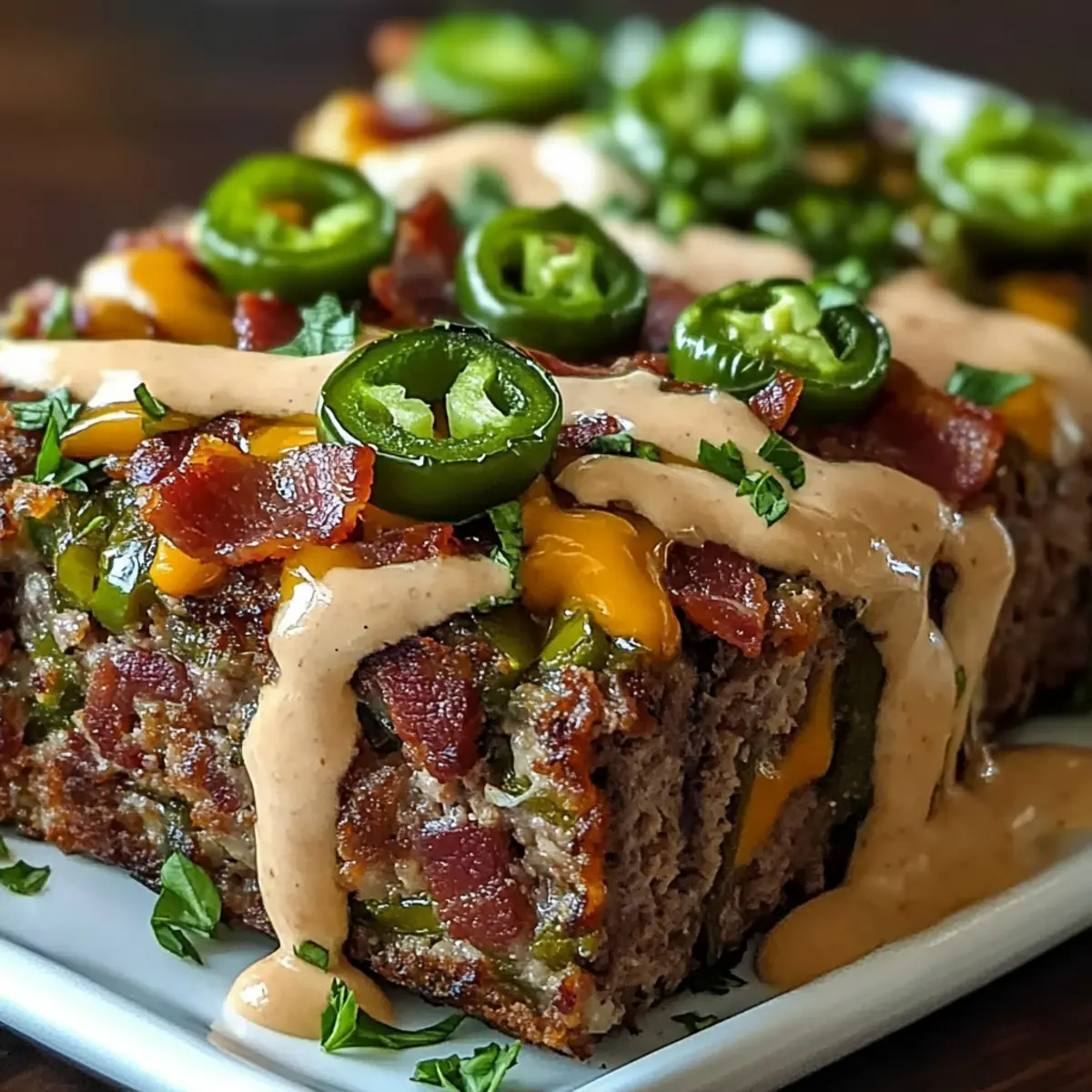 Slice the meatloaf into hearty portions and serve warm, either on its own or with a side of your favorite salad or vegetables. Consider adding a drizzle of ranch dressing for a delicious dipping option to enhance the flavors. Each bite should reflect the delightful combination of smoky, spicy, and creamy sensations, making your dining experience truly memorable.
