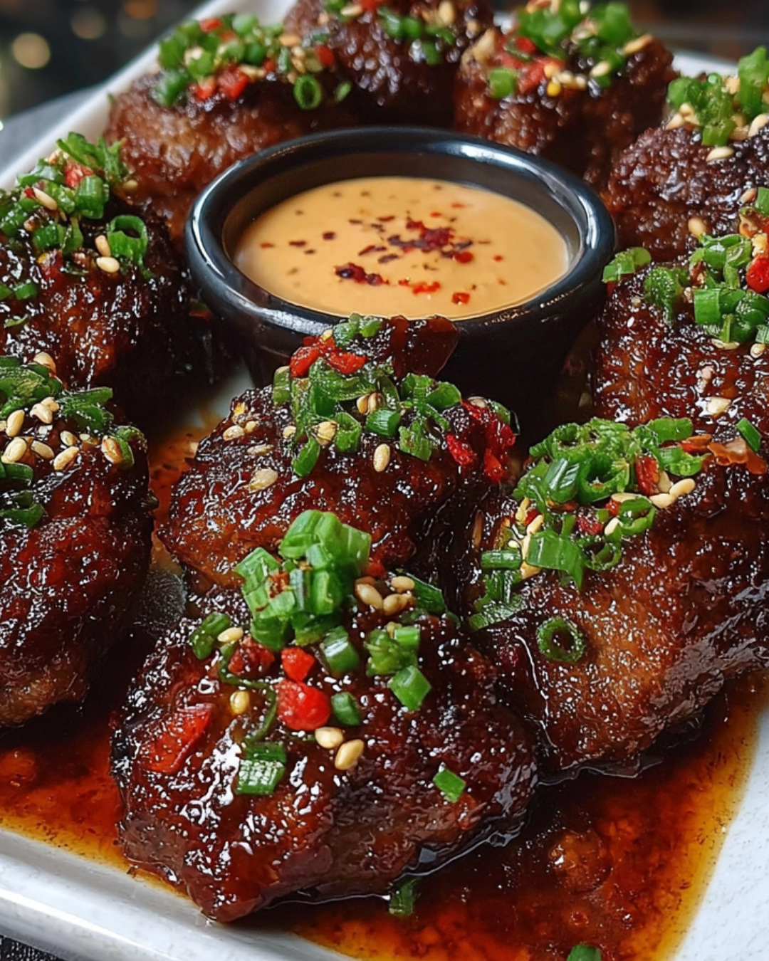 - Once the beef bites are done, remove them from the oven and let them cool for a few minutes. Serve warm, garnished with the remaining green onions and sesame seeds if desired, alongside the dipping sauce.