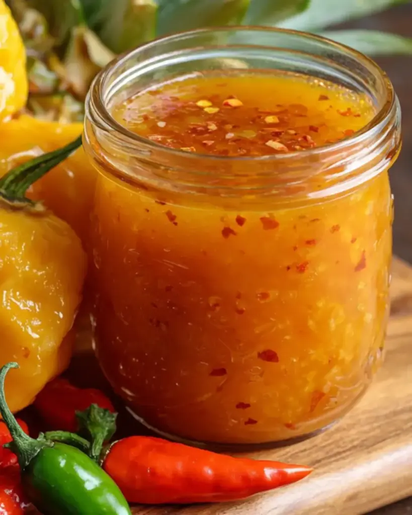 A vibrant and spicy hot sauce made with fresh pineapple and habanero peppers, perfect for igniting your taste buds.