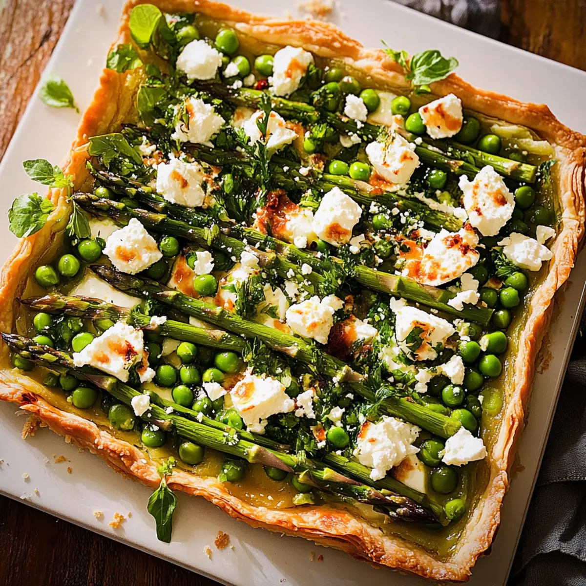 Vibrant Colors: The Spring Asparagus, Pea and Feta Tart showcases a beautiful medley of green vegetables, making it not just delicious but also a feast for the eyes.