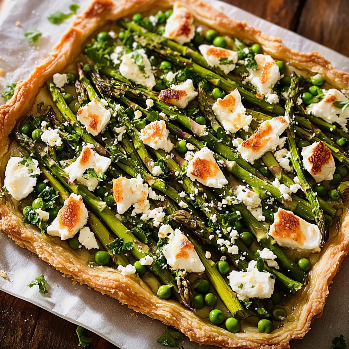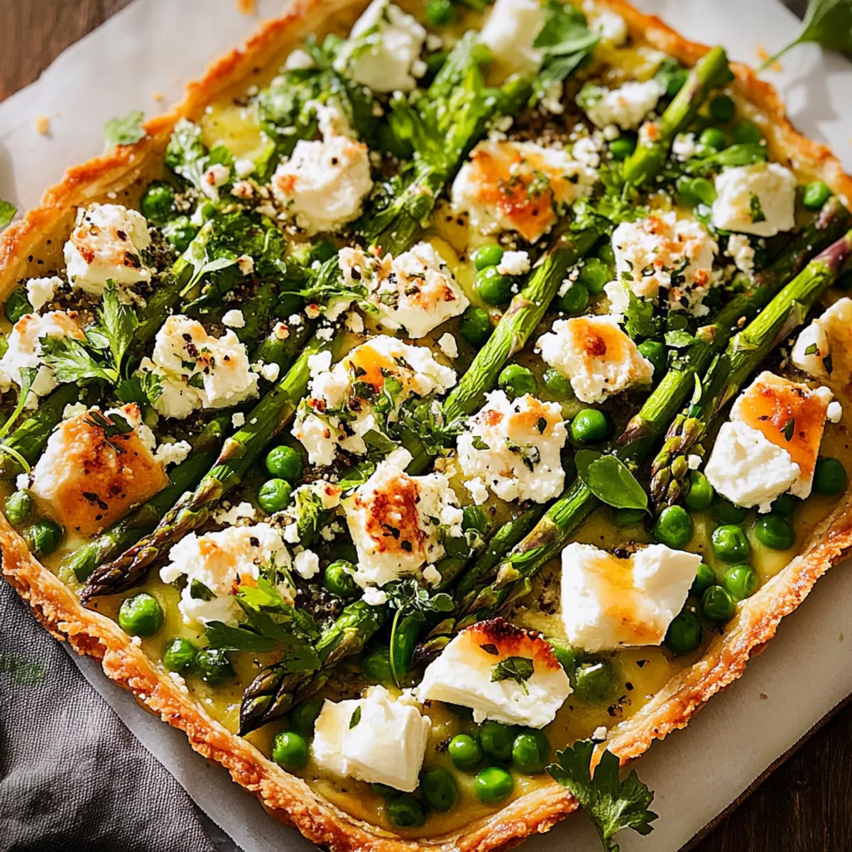Crumble the feta cheese generously over the top of the tart, allowing its creamy texture to meld into the filling as it bakes. The feta adds a delightful tanginess that perfectly complements the sweet peas and earthy asparagus.