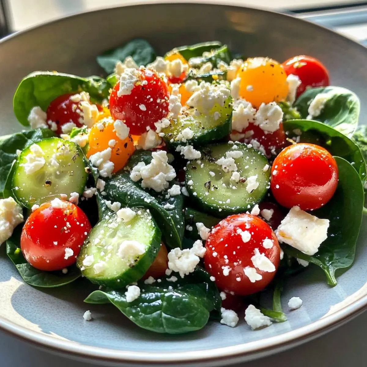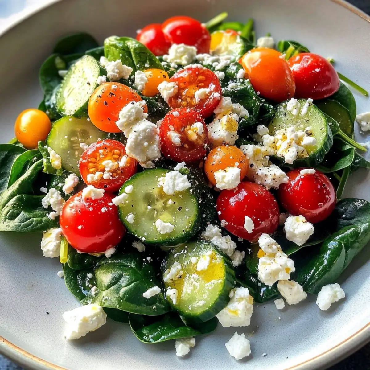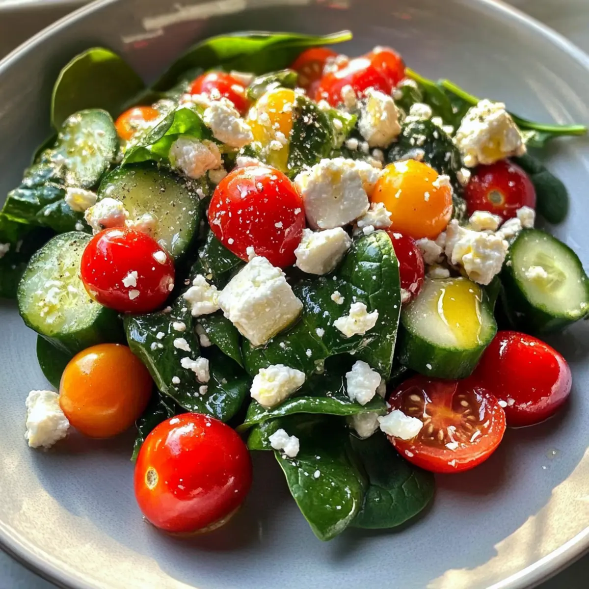 Sprinkle the crumbled feta cheese generously over the mixed vegetables. This creamy addition provides a delightful tang that enhances the freshness of the salad. Make sure the feta is evenly distributed, as each bite should encapsulate the contrasting flavors of the spinach and other veggies with the rich creaminess of the cheese.