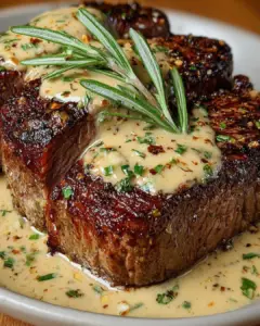 A delicious ribeye steak served with a rich bourbon garlic cream sauce, perfect for a special dinner.
