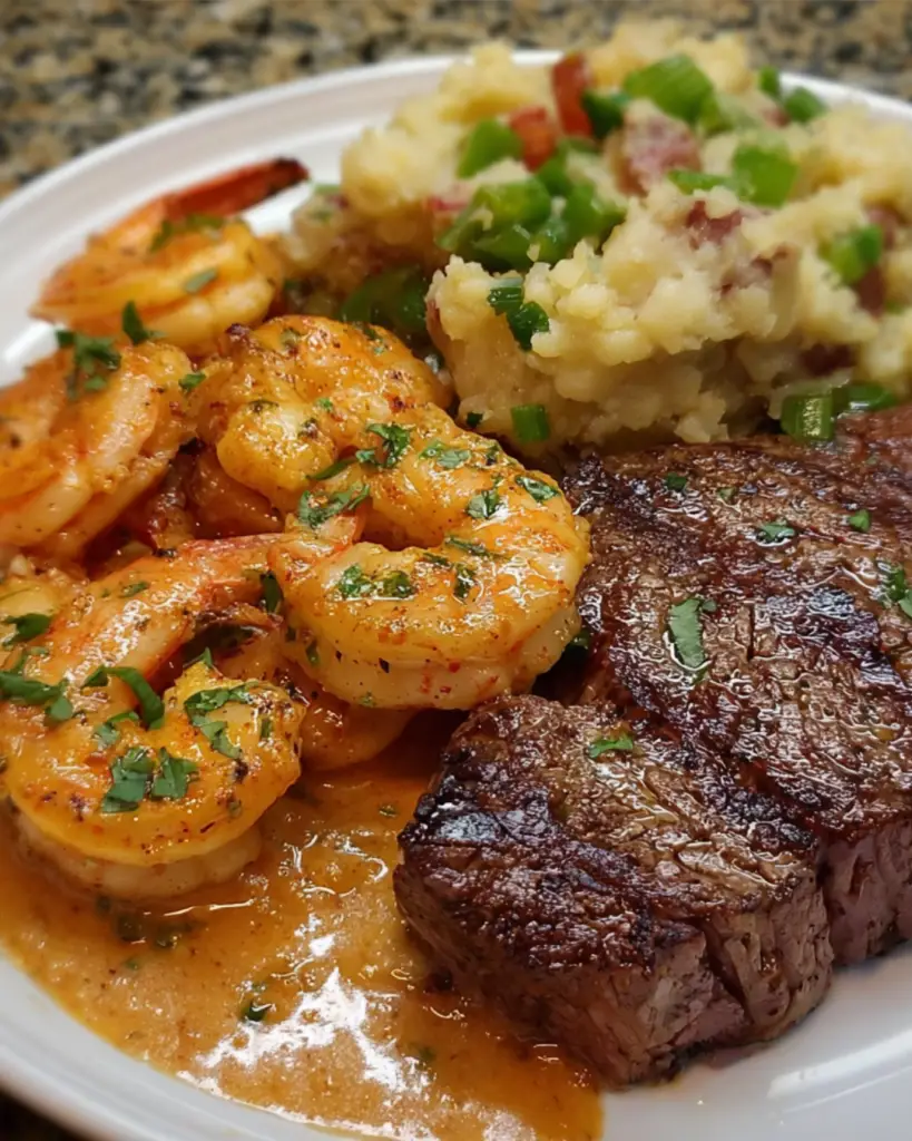 There’s something magical about a meal that brings together the bold flavors of steak and Cajun shrimp, all nestled atop a bed of creamy potatoes.