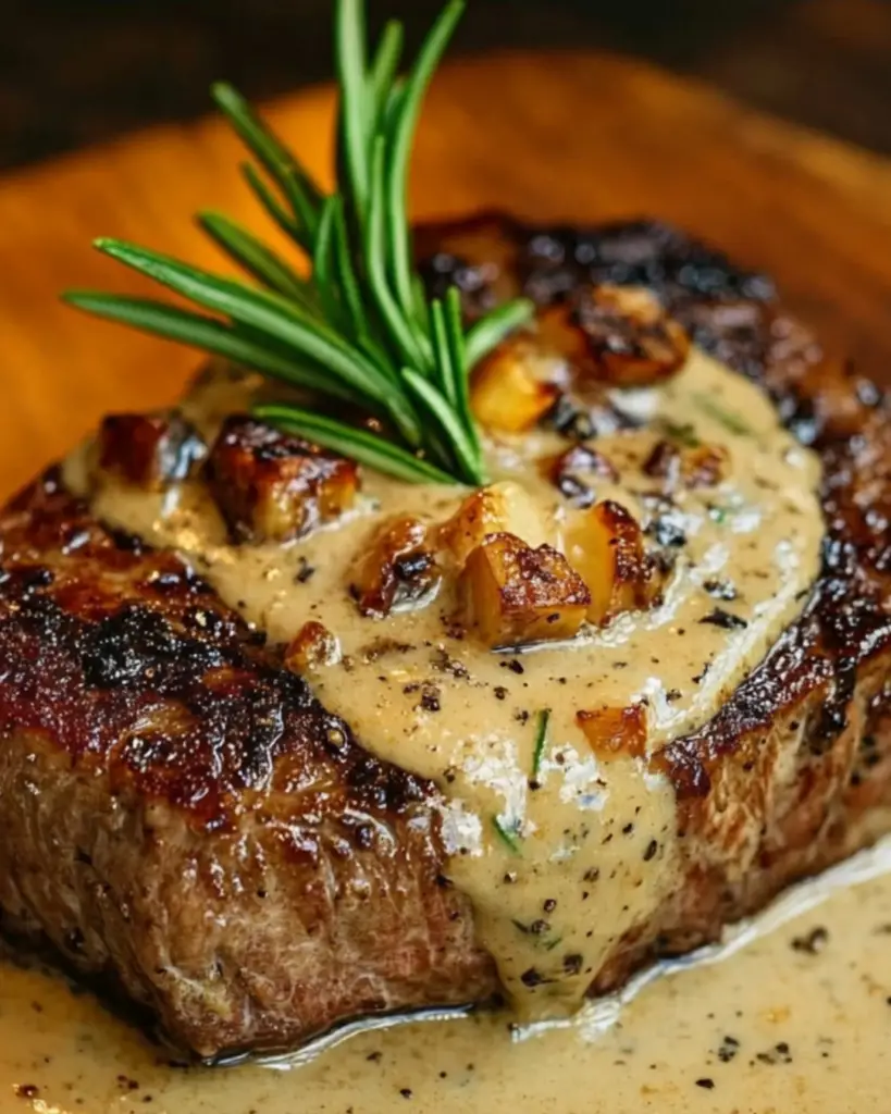 A delicious steak recipe topped with a rich and creamy haunted bourbon garlic sauce, perfect for a flavorful dinner.