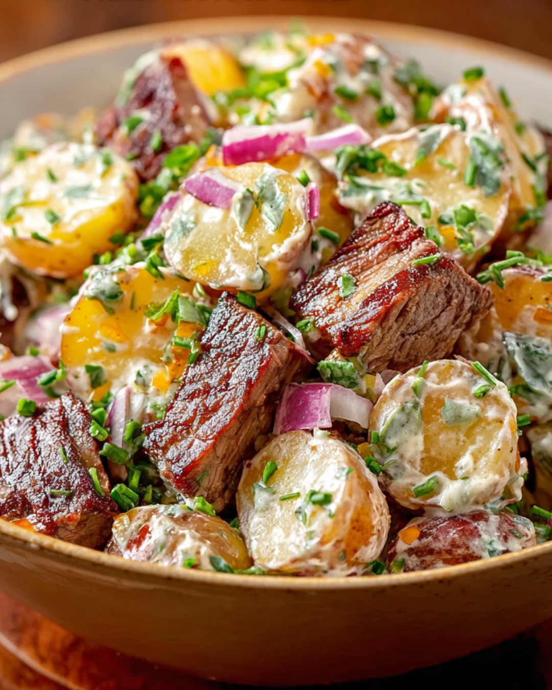 A creamy and flavorful steakhouse potato salad that combines tender baby potatoes with a rich dressing and crispy bacon.
