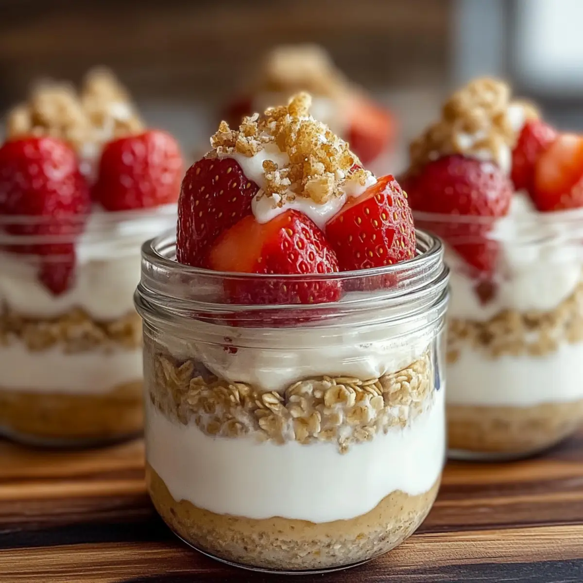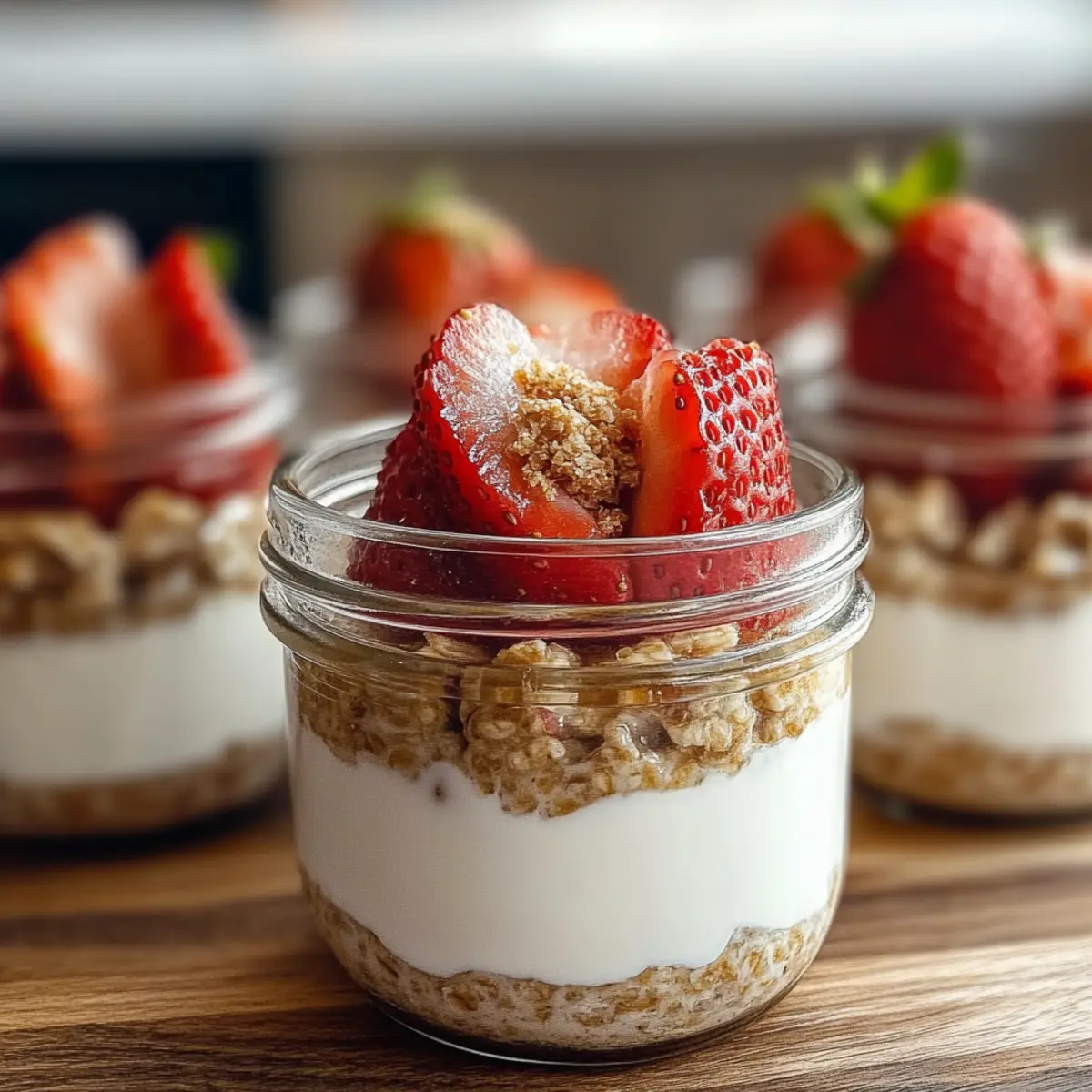 The next morning, remove the jars from the fridge. Give the mixture a good stir, making sure everything is well combined. Top with crushed graham crackers and additional strawberries before serving. The final look should be inviting and creamy, resembling a cheesecake delight ready to kickstart your day!