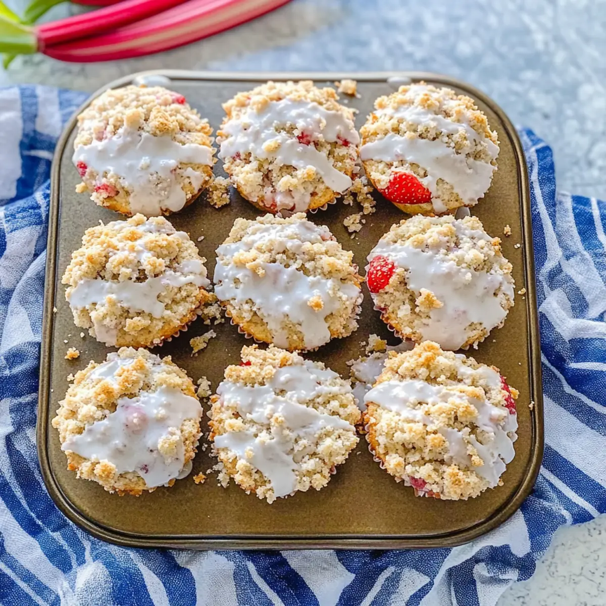 Absolutely! For the best results, use fresh rhubarb with vibrant red stalks. Avoid stalks with dark spots or wilting, as these can indicate overripeness. If fresh isn’t available, frozen rhubarb works perfectly too—just toss it directly into the batter without thawing to avoid sogginess.