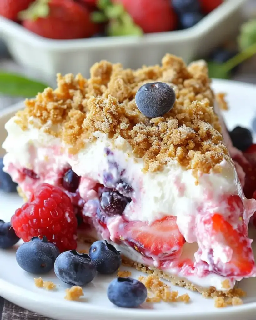 - Before serving, let the dessert sit at room temperature for 10–15 minutes to soften slightly. Cut into squares and serve chilled. Optional: Garnish with extra fresh berries or a dollop of whipped cream.