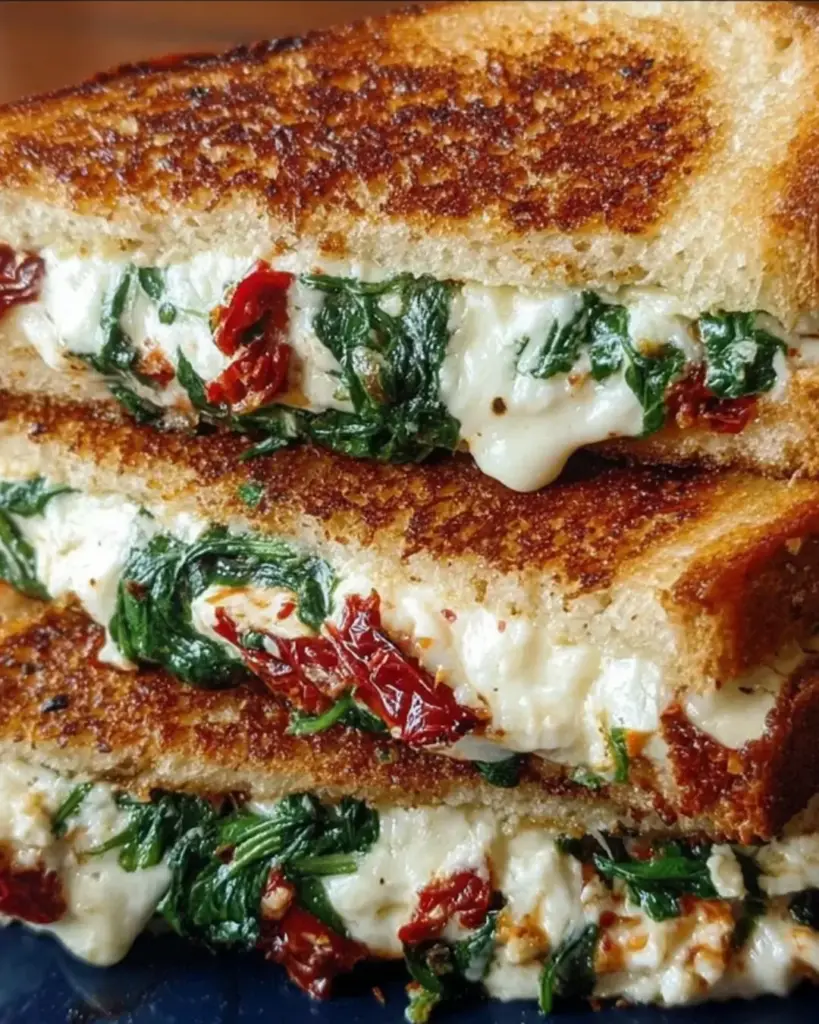 A delicious grilled cheese sandwich featuring sun-dried tomatoes, fresh spinach, and creamy ricotta cheese, perfect for a quick meal.