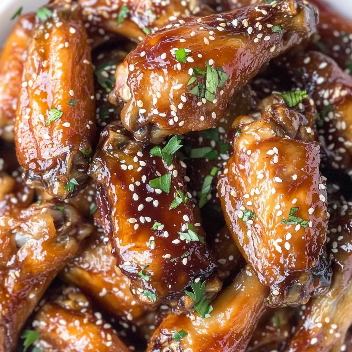 - Serve the wings on a platter, drizzled with sauce, and garnish with sesame seeds and parsley.